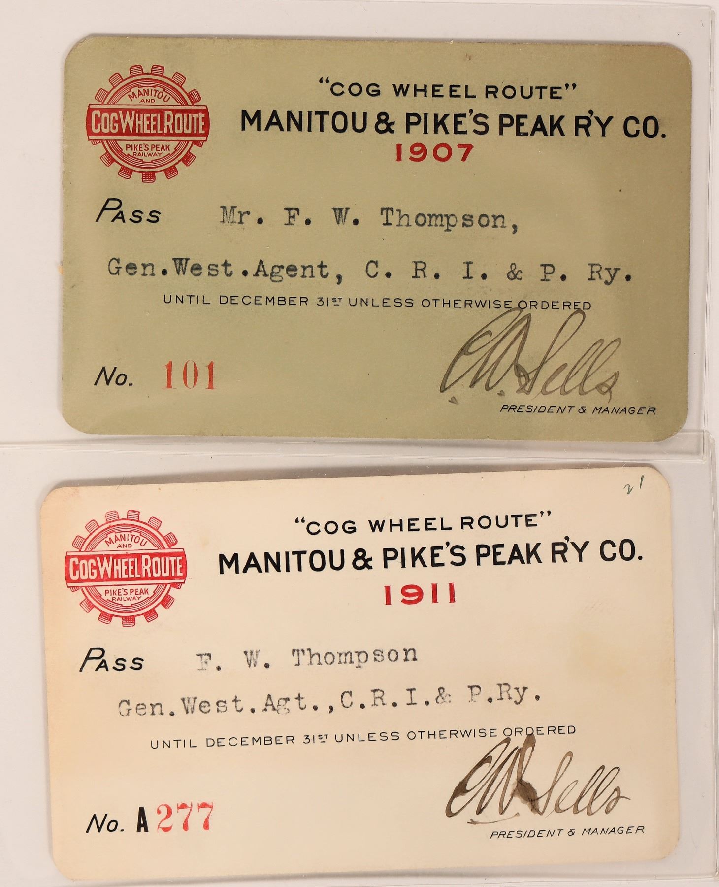 Lot of 2. Both issued to F W Thompson, CRI&P RY, signed pres. and Mgr. card stock, blk print, upper left corner logo in color. #101 issued 1907 and # A277 issued 1911. Unk. Printer. Established in 1889 by Zalon Simmons ( Simmons Beauty Rest Mattress Co.). Then purchased in 1925 by Spencer Penrose owner of the Broadmoor Hotel adding it to the Broadmoor family. which still owns the railway and has mad numerous improvements over the years. Transportation
