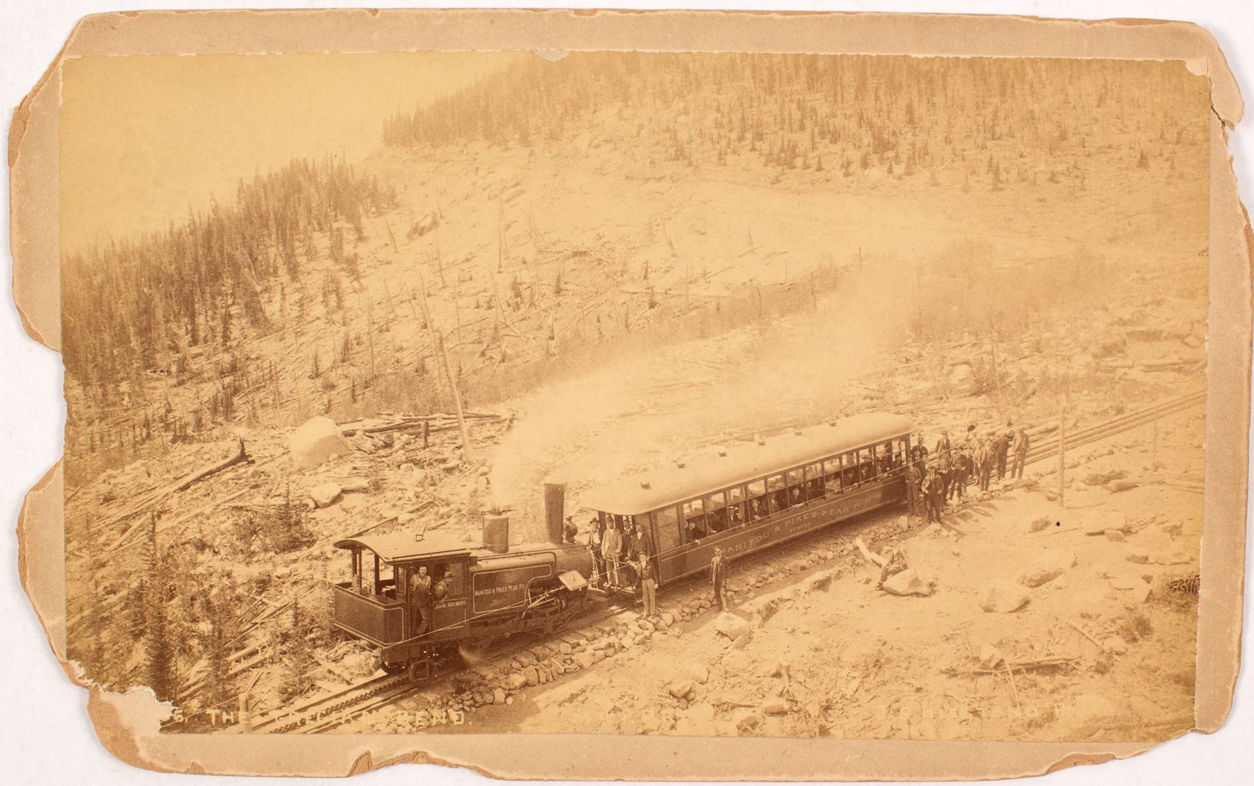 Original cabinet card showing the engine and one passenger car for the Manitou and Pikes Peak RR. Engine is marked "John Hulbert". Photo "Grecian Bend". chipped at edges "From US Signal Station, Summit of Pikes Peak, Colorado" on reverse.
