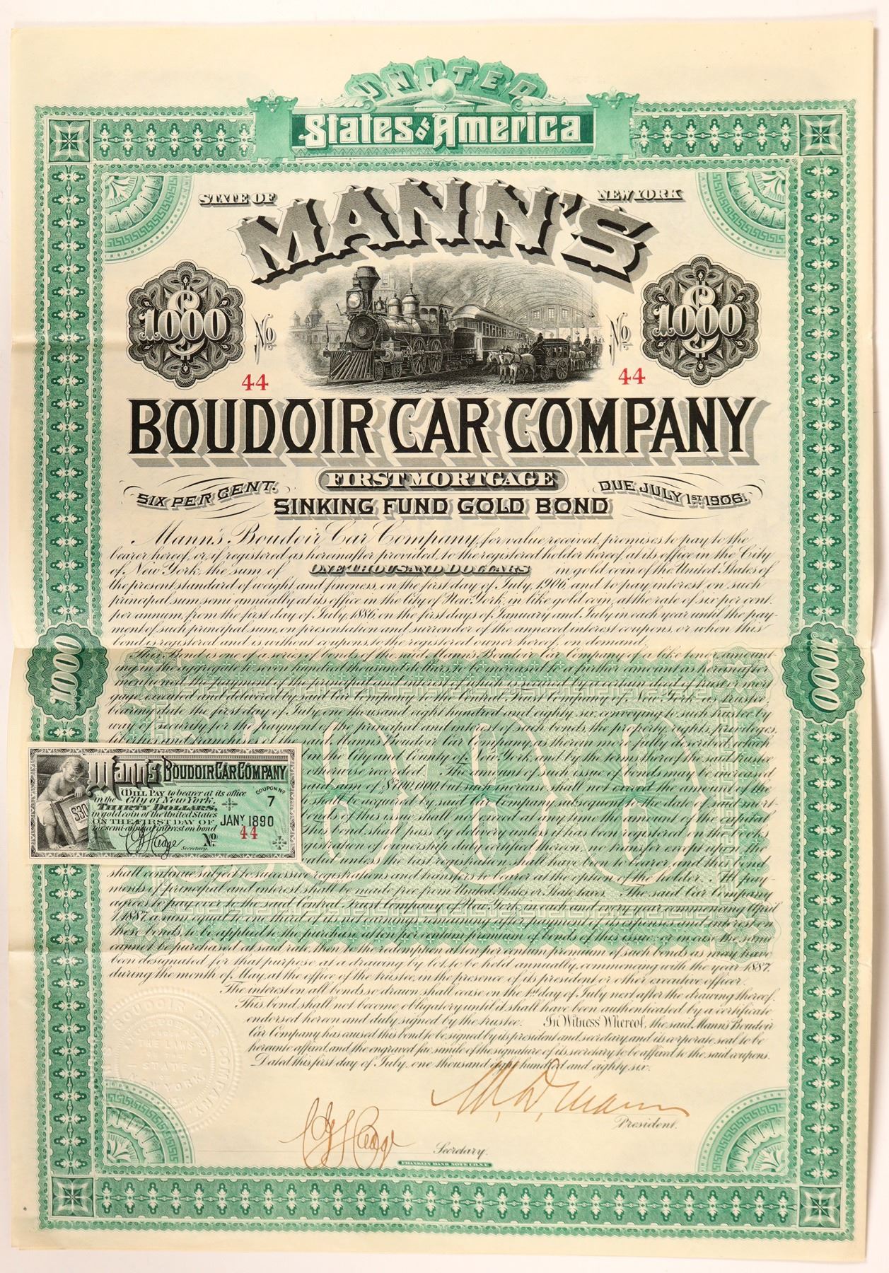 Very attractive bond certificate issued in 1886 and signed by W.D. Mann as president. $1,000, 6%, Sinking Fund Gold Bond, due 1906. Train r-l in train shed. I/U. Full page of coupons at the right. VF.
