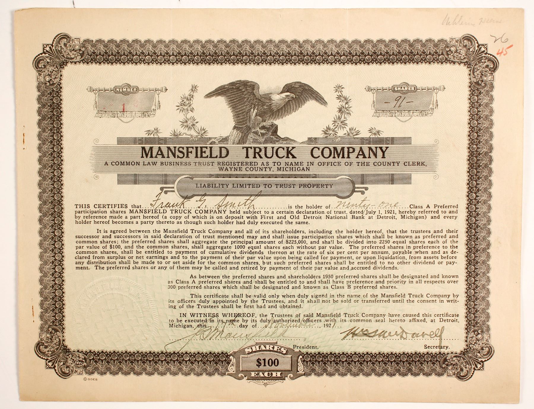 91 shares of Mansfield Truck Co., cert #1. Issued to Frank G. Smith. Raised seal, gray border. Vignette of eagle on rock with spread wings. Signed Mansfield, pres.on Nov. 17, 1921. Mansfield Truck Co is a common law business trust registered in Wayne county, Michigan. Printed: GOES. Ken Prag Collection