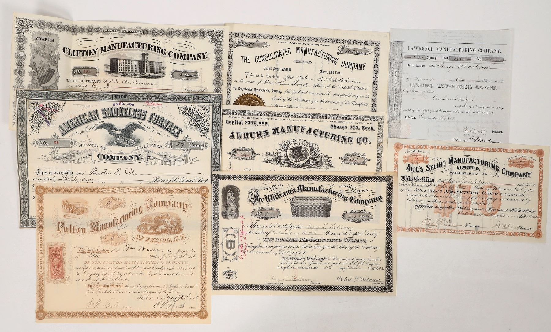 Issued-1902 Williams Manufacturing, 1858 Lawrence Manufacturing, 1884 Ahl's Splint, 1885 American Smokeless Furnace, 1880 Auburn Manufacturing, 1887 Consolidated Manufacturing, 1882 Clifton Manufacturing, 1868 Fulton Manufacturing, 1897 Pepperell Manufacturing.