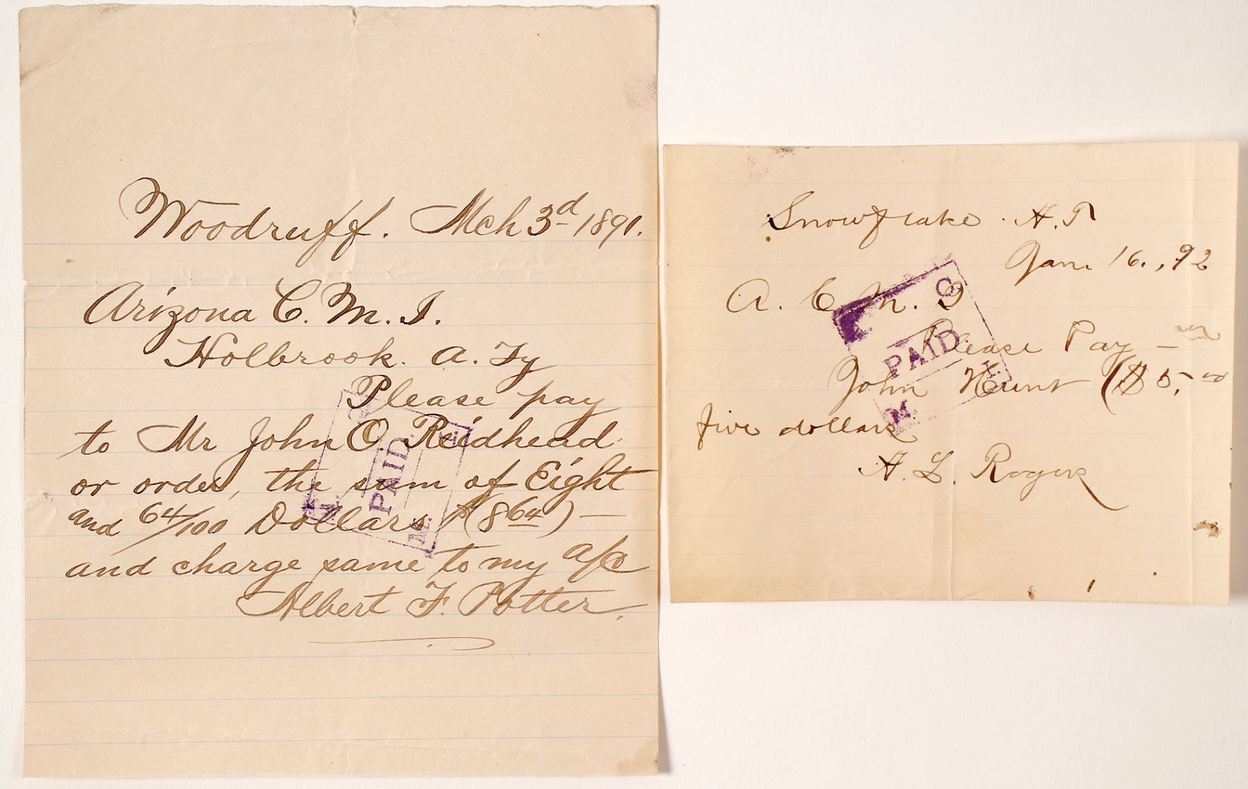 2 rare manuscript pieces from Arizona to Holbrook A. Ty from Albert F. Potter. 5" x 6". Slight stain on back in fold lines. Date: 1891 Location: Arizona HWAC# 56778