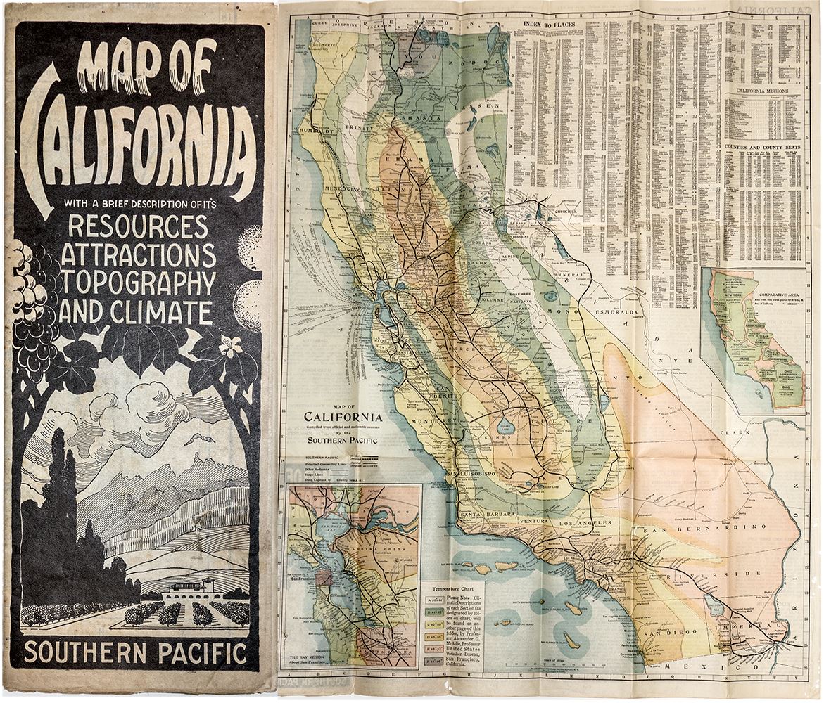 California map published by Southern Pacific Railroad with descriptions of resources, attractions topography and climate. map folds out to 27" x 21"; good condition, some edges have tiny tears.