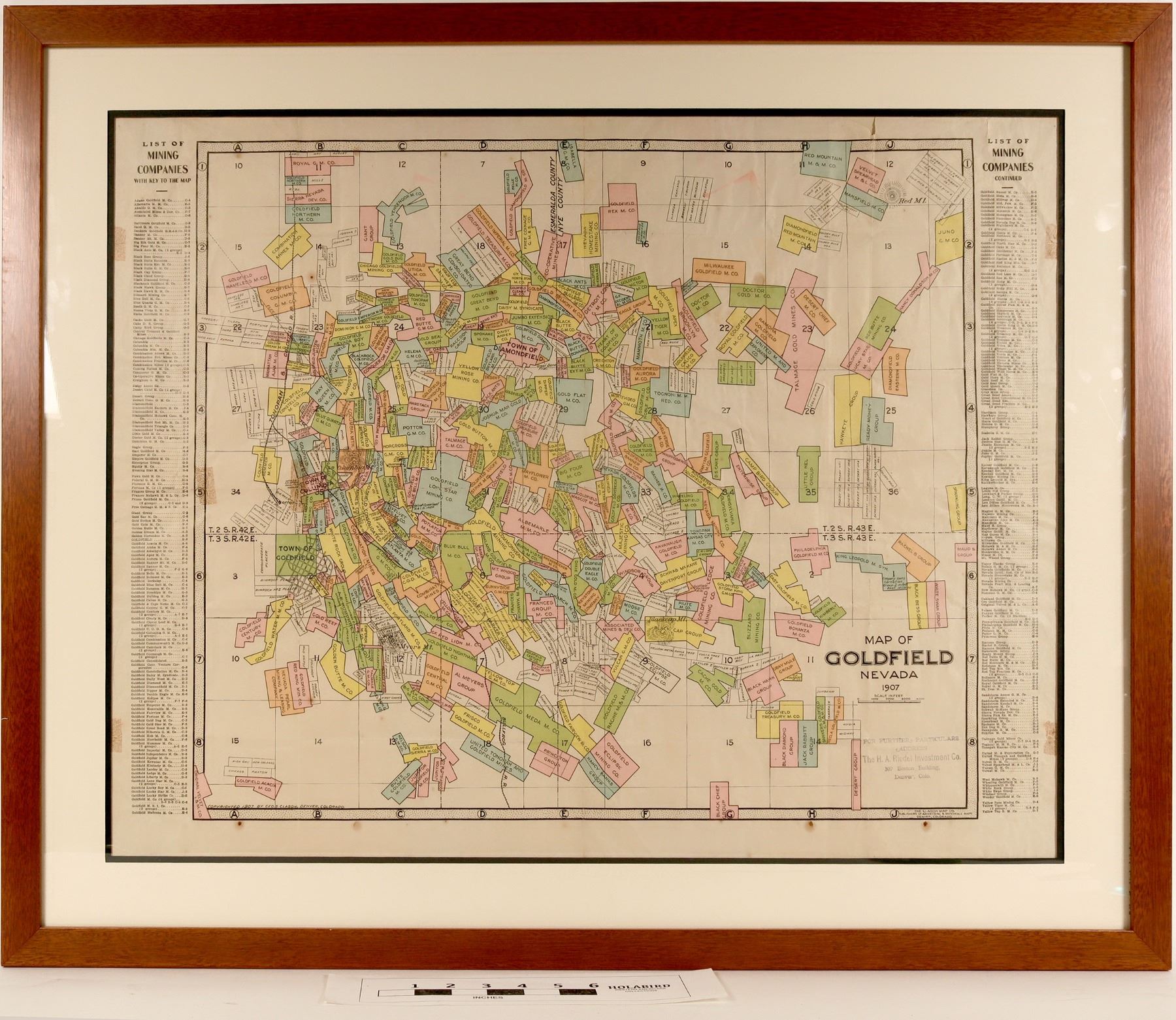 Map of Goldfield, Nevada, 1907, by The Clason Map Co., publishers of Advertising & Reference Maps, Denver, Colorado. Includes an extensive alphabetical list of mining companies along the left and right margins along with the claim boundaries of the mining claims in and around the town of Goldfield. All the colors are still bright and vibrant. This map is from one of the best collection of mining ephemera anywhere, and it has been professionally mounted in a pecan(?) frame and plexiglas, 27-1/2 x 21-1/2 inches. There is a minor half-inch tear along the top edge of the map, four old tape marks along the left and right edges, and a quarter-inch circular stain along the bottom edge that probably came from the metal clasp of the envelope that once held this map when it was published. Other than that, you may never find another copy of this map available in better condition in your lifetime. It will be a prized display piece on whatever wall you hang it.