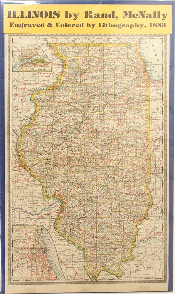 Illinois by Rand, McNally engraved & hand colored by Lithography. Vivid colors, very good condition. On Mat Board (not adhered) with plastic covers. If mats are shipped then additional shipping may apply. 17" x 28". (Potter Collection) Date: 1883 Location: Illinois HWAC# 59324