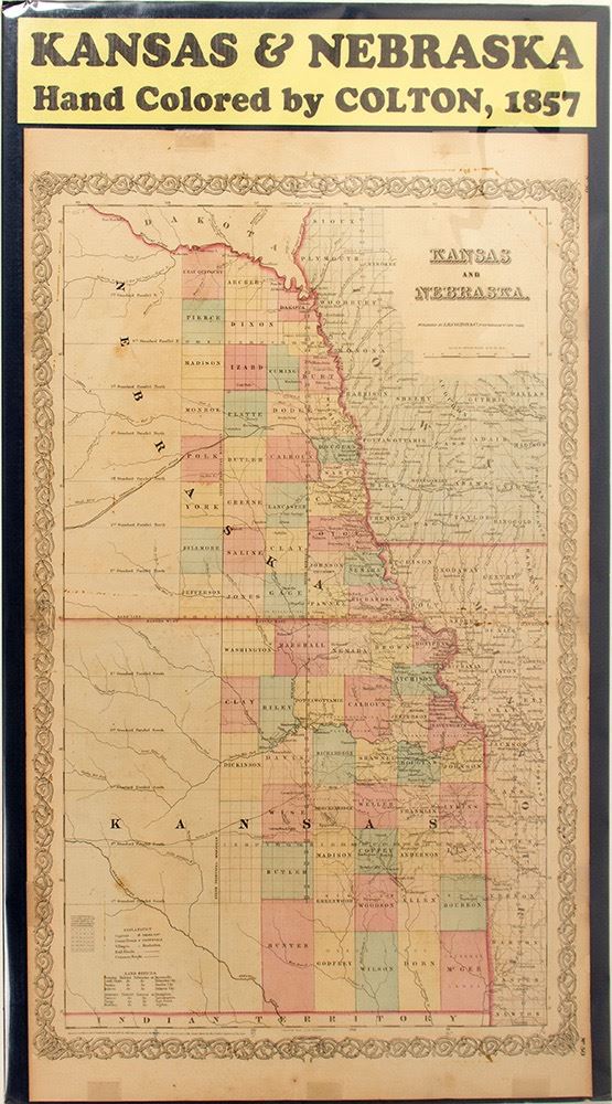 Map of Kansas & Nebraska, hand colored by Colton, double truck. This map shows the route to Platte River & Pikes Peak. Slight staining on upper right of map. On Mat Board (not adhered) with plastic covers. If mats are shipped then additional shipping may apply. 17.5" x 28". (Potter Collection) Date: 1857 Location: Kansas HWAC# 59325