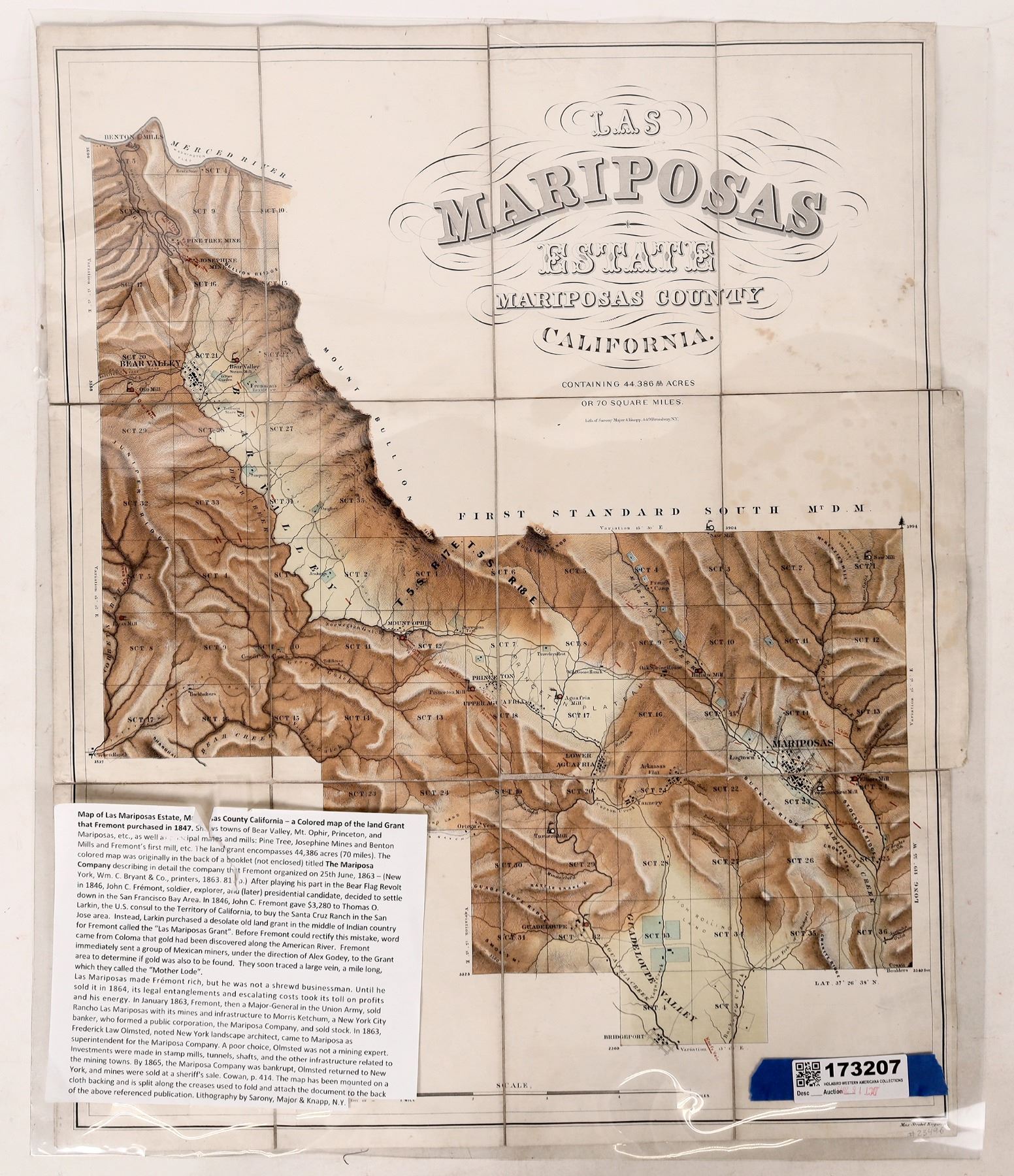 Lithograph has been mounted on cloth backing, split at seems. Originally a fold out map from "The Mariposa Company". 28 x 21". Shows towns of Bear Valley, Mt. Ophir, Princeton and Mariposa. Also principal mines and Mills: Pine Tree, Josephine mines and Benton Mills - Fremont's first mill. Comes with detailed description of Las Mariposa and Fremont. Purchased in 1846. Fremont struck it rich, but was not a shrewd businessman. By 1865 the Mariposa Company was bankrupt. Mariposa California Franklin Collection