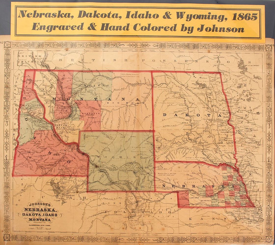 Double truck, engraved & hand colored by Johnson. Gray border, colors are vivid. Slight .25" tear at bottom, middle, does not encroach on map. On Mat Board (not adhered) with plastic covers. If mats are shipped then additional shipping may apply. 24" x 17.5". (Potter Collection) HWAC# 59603 Date: 1865 Location: Nebraska