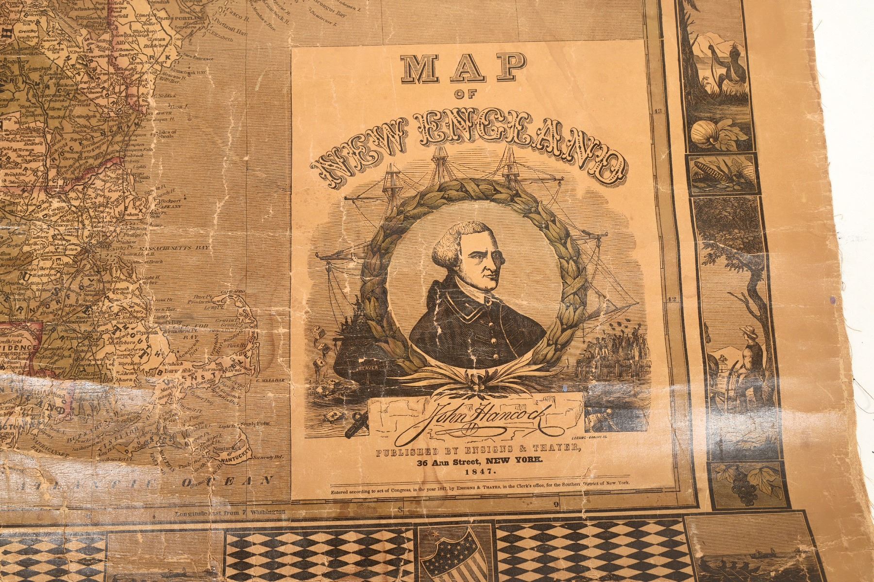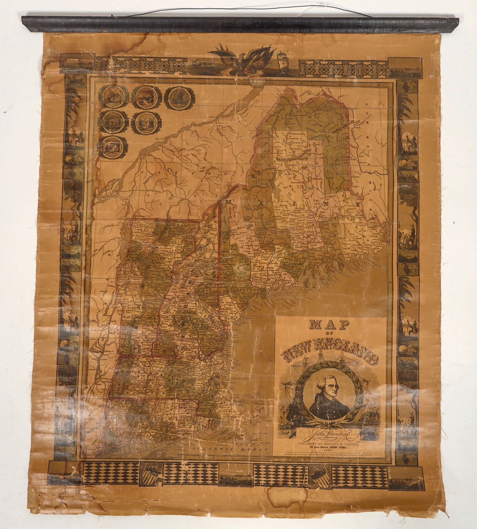 Fabric map (26 x 32 inches) on a wooden hanger published by Ensigns & Thayer, 36 Ann Street, New York. Vignettes around the perimeter. Some staining at bottom, lower edge ragged. Cartouche features portrait of John Hancock with scene from the Boston Tea Party in background.