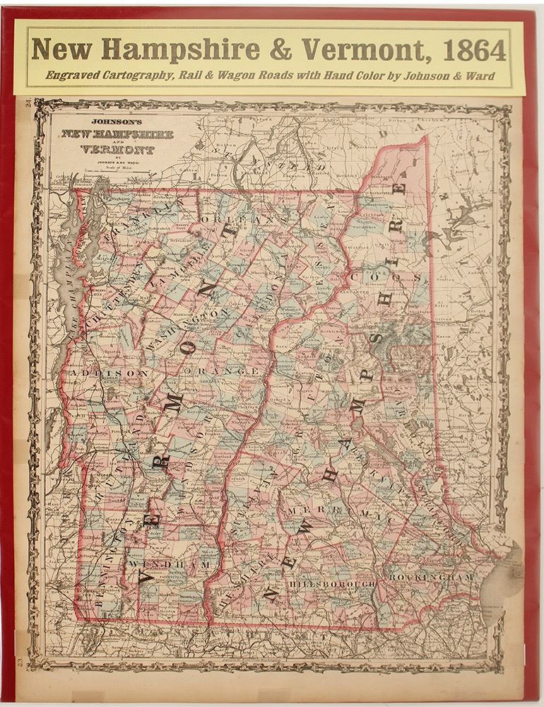 Map engraved cartography, rail & wagon roads with hand color by Johnson & Ward. Double truck, pp.23,24. Vivid color . Slight staining at left margin, does not encroach on map. 18" x 25.5". (Potter Collection) Mounted on mat board. If mats are shipped then additional shipping may apply. (Potter Collection) HWAC# 62075 Date: Location: New Hampshire