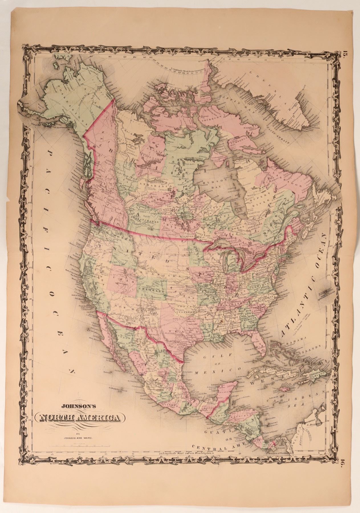 Multi-color, double truck map of Johnson's North America by Johnson and Ward. Shows north from Mt. Franklin at the Polar Sea all the way south to Panama. This map is in good condition only 1 chip at left side (does not encroach on border) and slight tear at crease approx 2.5". Please inspect. This is ready for frame. 16" x 21.75". City: State: Date: c1864