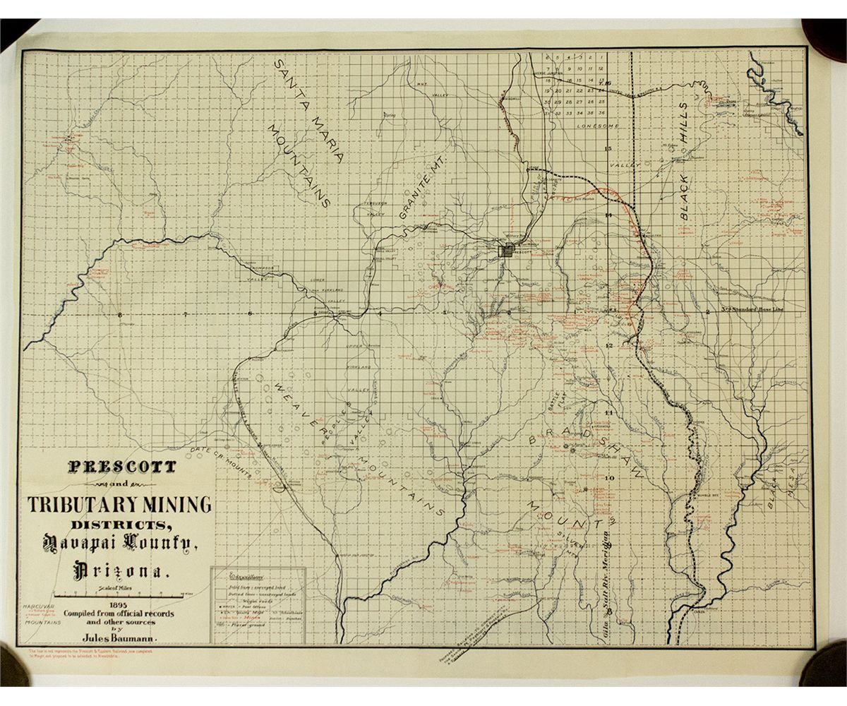 Compiled by Jules Baumann. Includes Black Hills, Bradshaw Mountains, Harcuvar Mountains, Santa Maria Mountains, Granite Mountain, Weaver Mountains. Includes wagon roads, post offices, school houses, and ranches. Placer and Quartz Mines. Surveyed line of the Black Canon Branch of the Southern Pacific RR. Proposed railroad to the Santa Fe, Prescott, & Phoenix Railway. 29x36”.City: PrescottCounty: YavapaiState: AZDate: