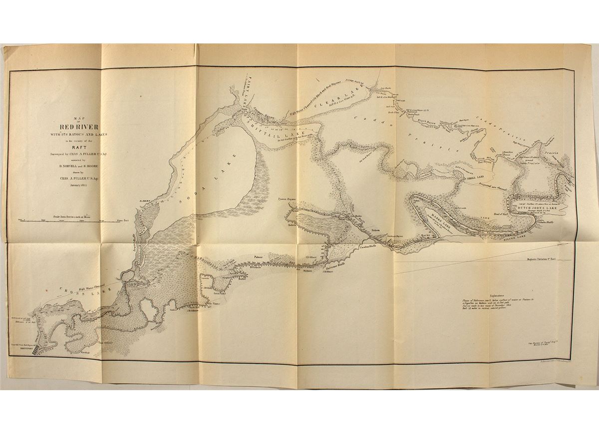 Bayous and lakes identified: Shiftail, Dutch Johns, Soda, Marks, Silver. By Charles A Fuller. Follows the course of the Red River from Shreveport, Louisiana to its confluence with the Red Bayou. Illustrates Fuller's travels on and inspection of the Red River. Using a simple raft, Fuller left Schreveport and began mapping the river in considerable detail with the expectation of various improvements intended to facilitate river commerce to follow. The map identifies numerous land holders along the river as well as adjacent rivers and lakes that could be used to bypass the main river artery. This is also the first appears on any map of Albany (lost to history) Louisiana, according to the Tourist's Description of Louisiana in 1860, a 'shipping point of some note' on Soda Lake. This map was engraved by Ackerman of Brooklyn, New York. 24 x 13". Some tears along the folds.