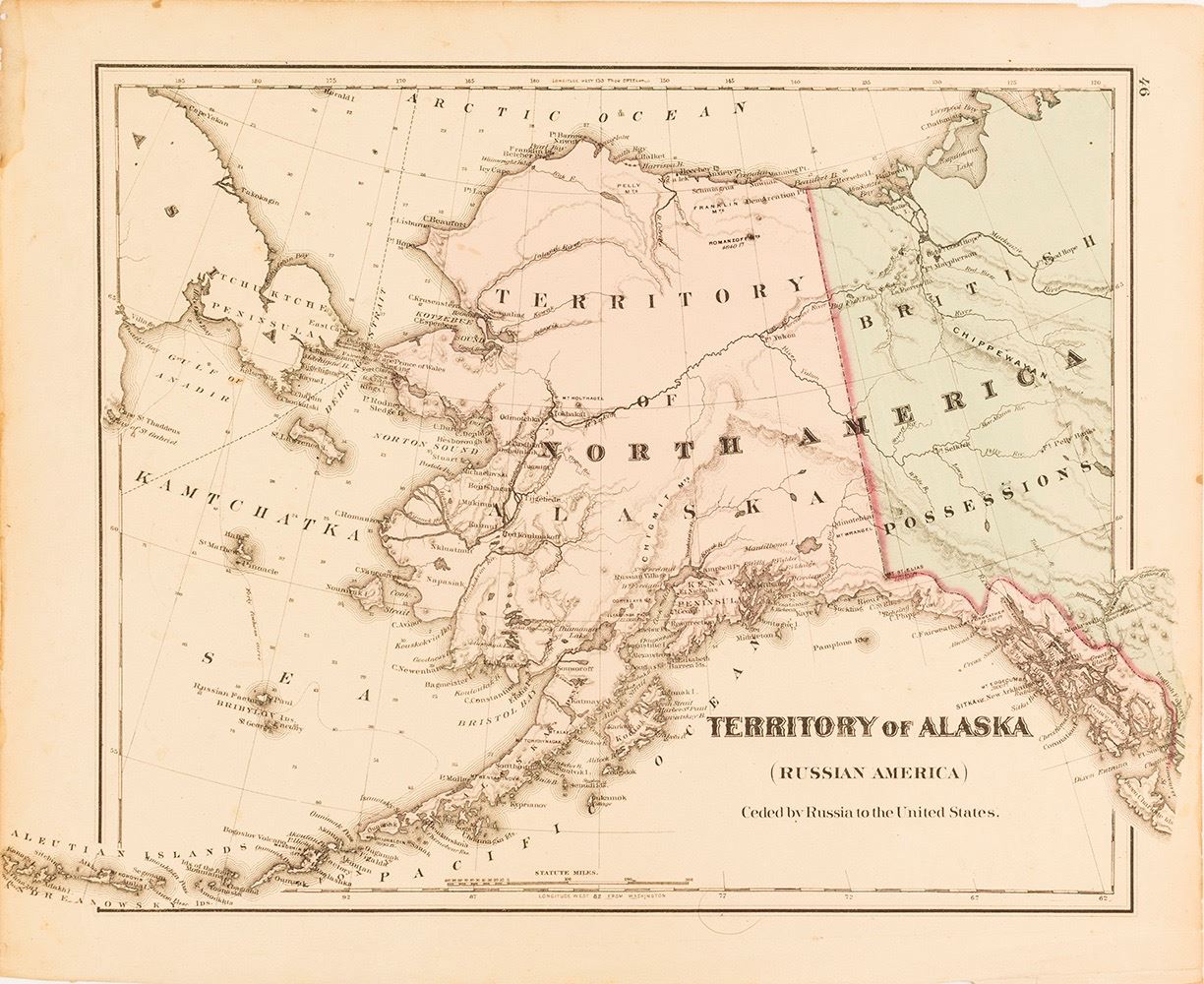 Single page, multi color lithograph of Territory of Alaska (Russian America) Ceded by Russia to the United States. Page #46. 13.5" x 17". Date: c. 1868 Location: Alaska HWAC # 54249