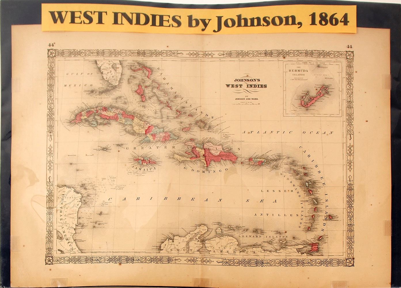 This map shows Greater Caribbean Sea, Lesser Antilles Windward Islands & much more. Havana was a stop for gold rush bound pioneers before going to Panama. Vivid color. Hand colored map by Johnson. Slight amount of staining on right side margin, good condition. On Mat Board (not adhered) with plastic covers. If mats are shipped then additional shipping may apply. 26.5" x 18". (Potter Collection) Date: 1864 Location: zWest Indies HWAC# 59628