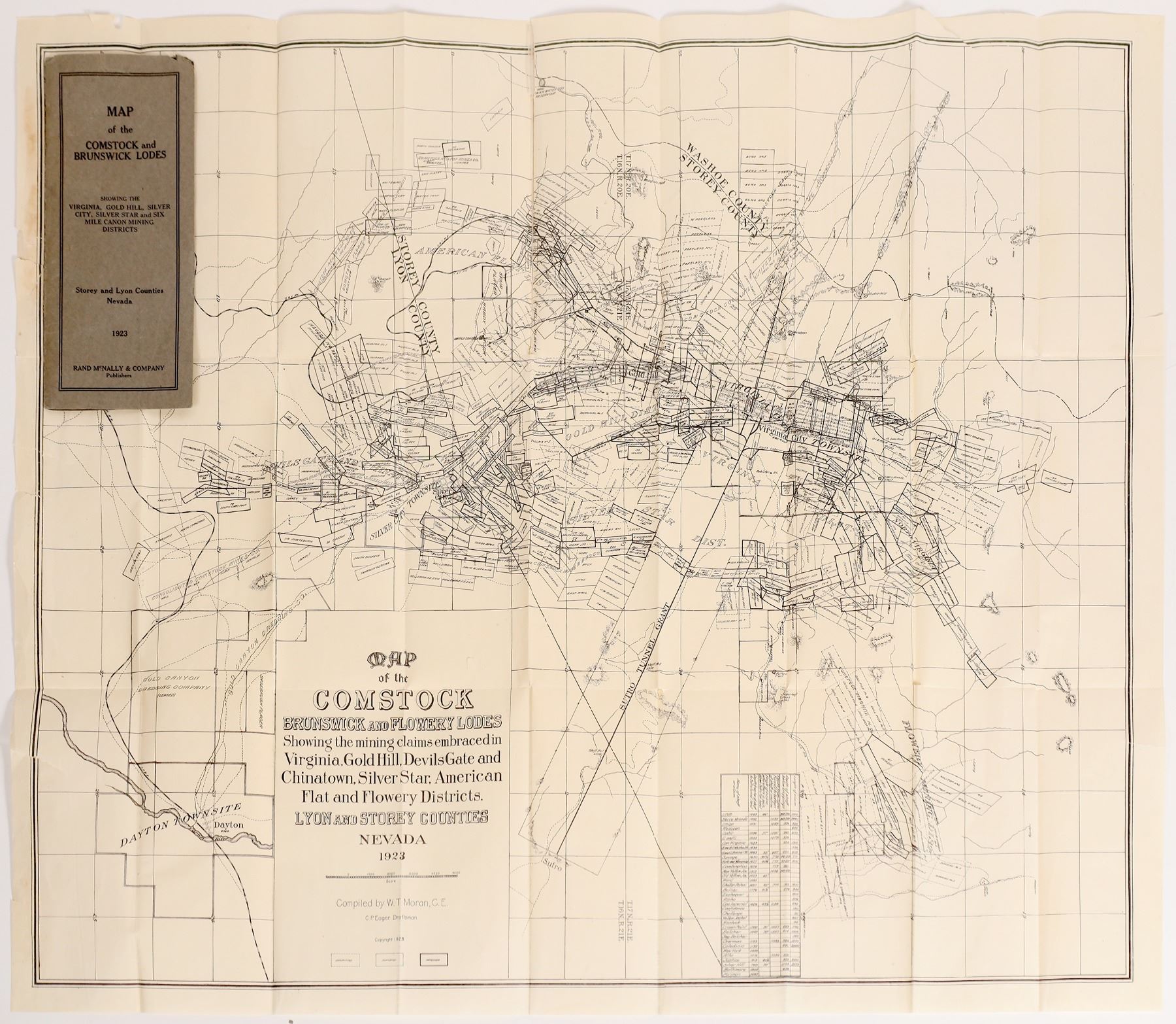 "Showing the Virginia, Gold Hill, Silver City, Silver Star and Six Mile Canon Mining Districts. Storey and Lyon Counties Nevada." 1923. Rand McNally & Company. Compiled by WT Moran, C.E. 26.5 x 32.25" Scale: 5000 ft. = 3". Rare and very detailed! Condition issues: torn out of the booklet, tape repairs, and tears. Please see photo. Virginia City Nevada Franklin Collection