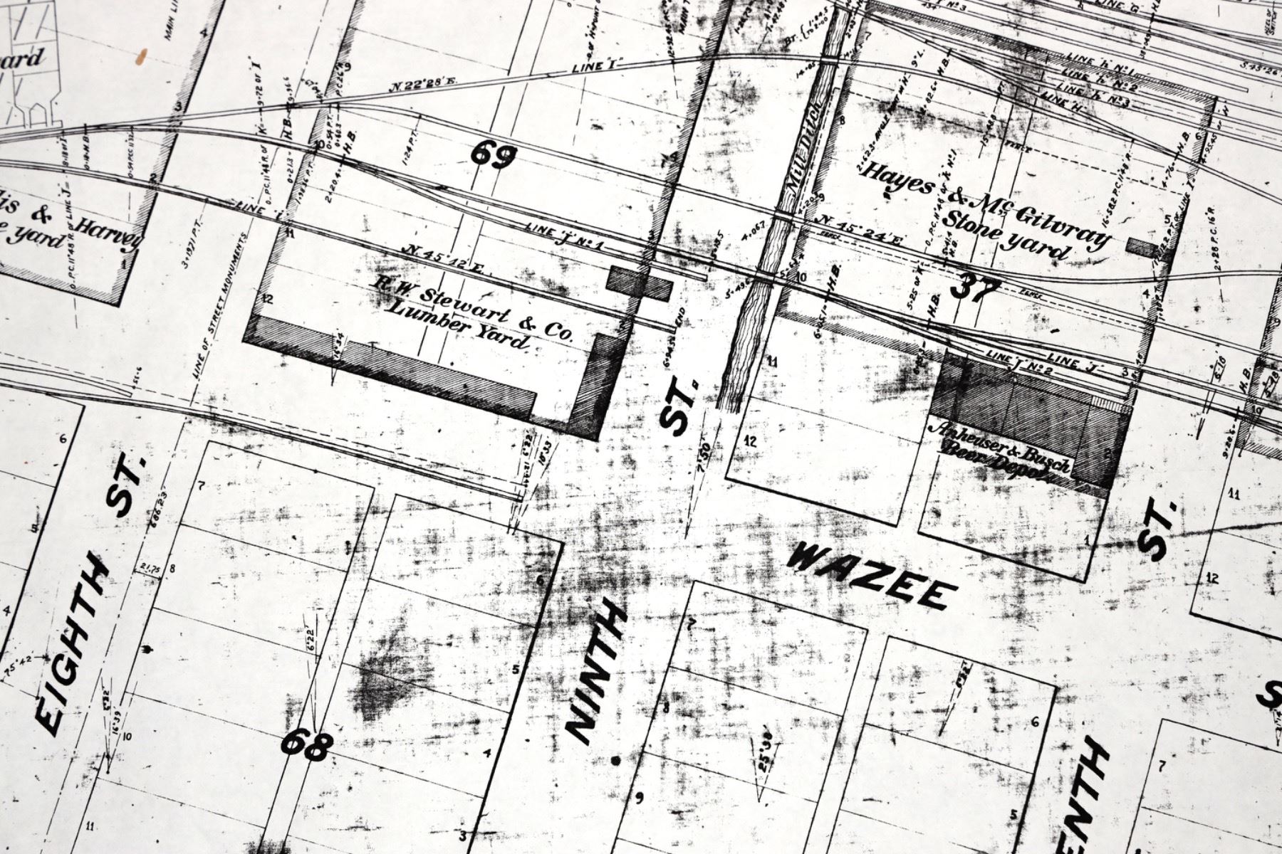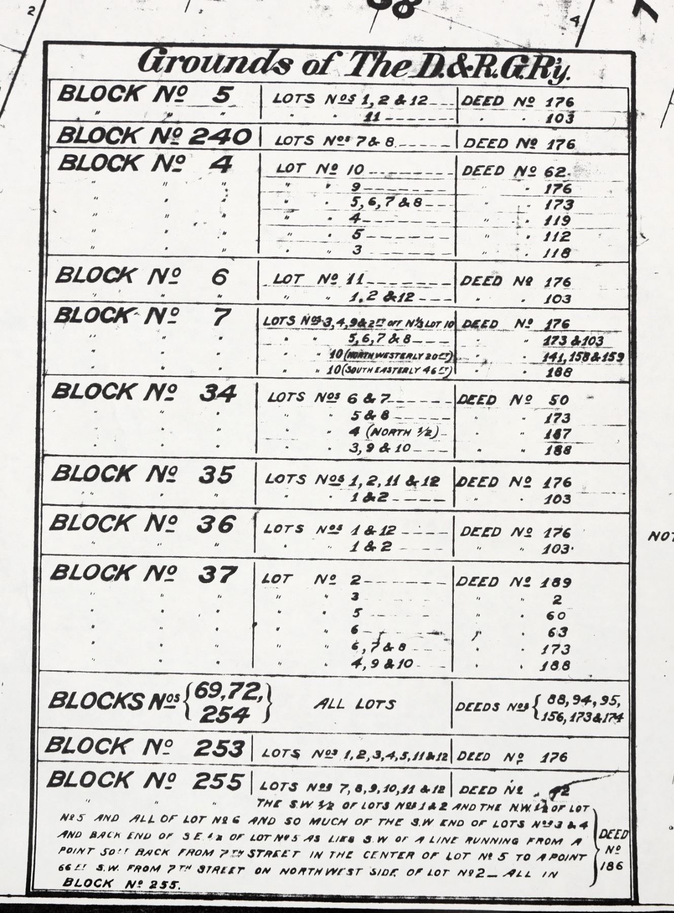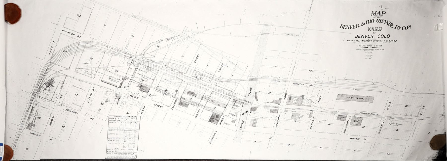 Reproduction. Showing all tracks, connections, grounds & buildings. Scale:1"=60 feet. Surveyed Dec. 1883, by HM Rogers. List of grounds occupied consists of 14 blocks totaling 106 lots and 40 deeds. Map is 3 x 10 feet.