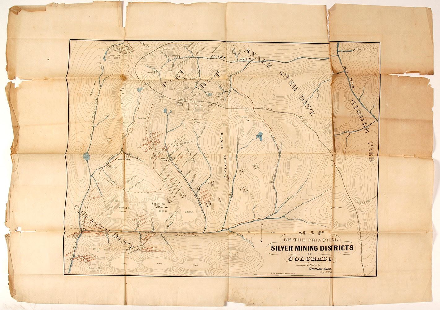 23.75 x 32.5" Extra rare 1866 map Surveyed and Platted by Richard Irwin, Sept. 28th, 1866. Scale 1 inch=2900 feet. Printed by the Western Engraving Co., Chicago. In addition to numerous mines, this fabulous early Colorado map shows towns such as Pineville, Georgetown, Elisabeth, Argentine City, Dibbin City, Silveropolis, Peru, and Montezuma. Districts include: Snake River, Middle Park, Peru, Argentine, and Griffith. Also shows trails and wagon roads. This map needs to be repaired and protected. Expected folds but also large panels separating, creases, tears, etc. With some TLC, this would be great framed. Please inspect! Date: Location: Colorado HWAC# 57635