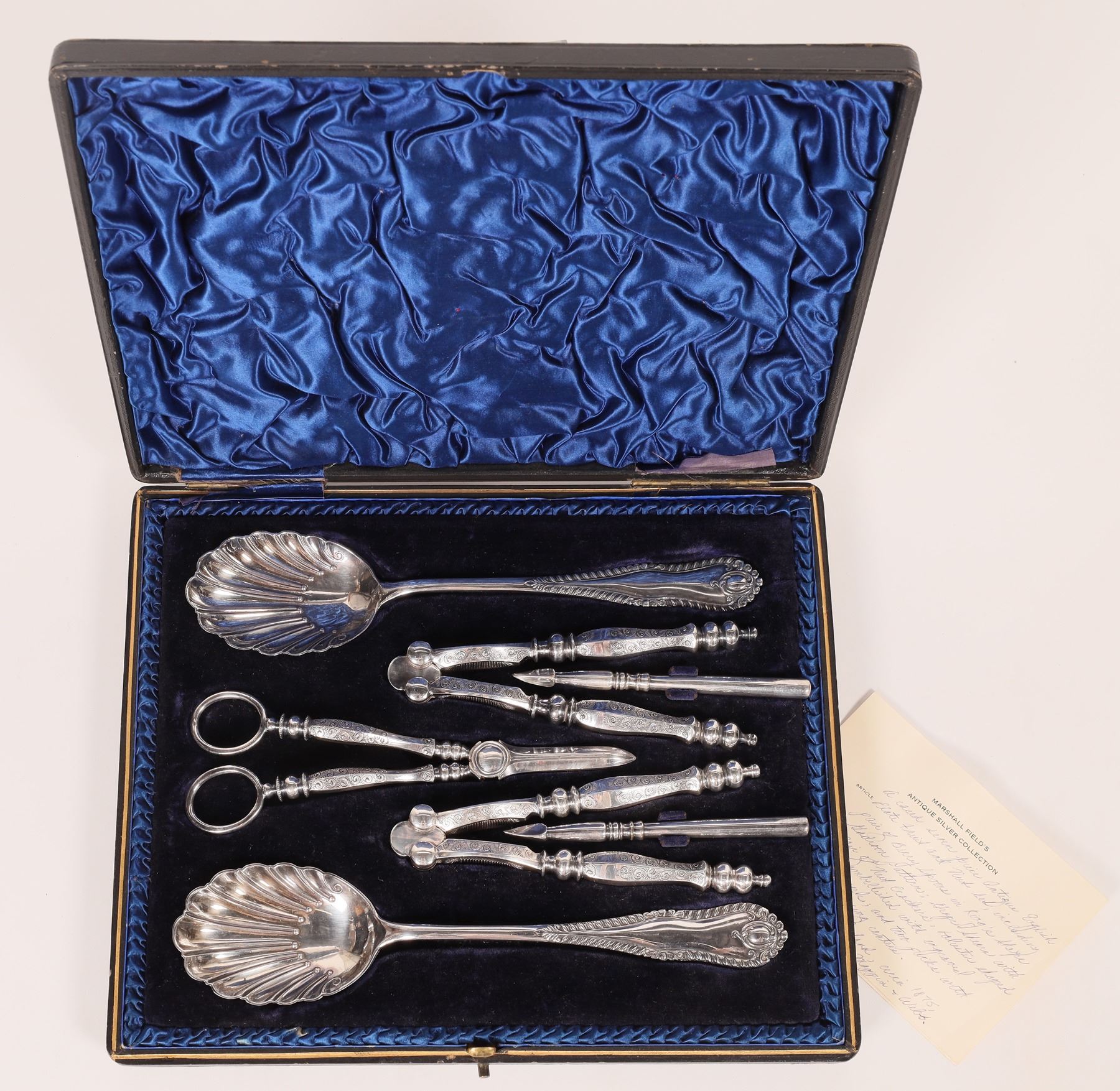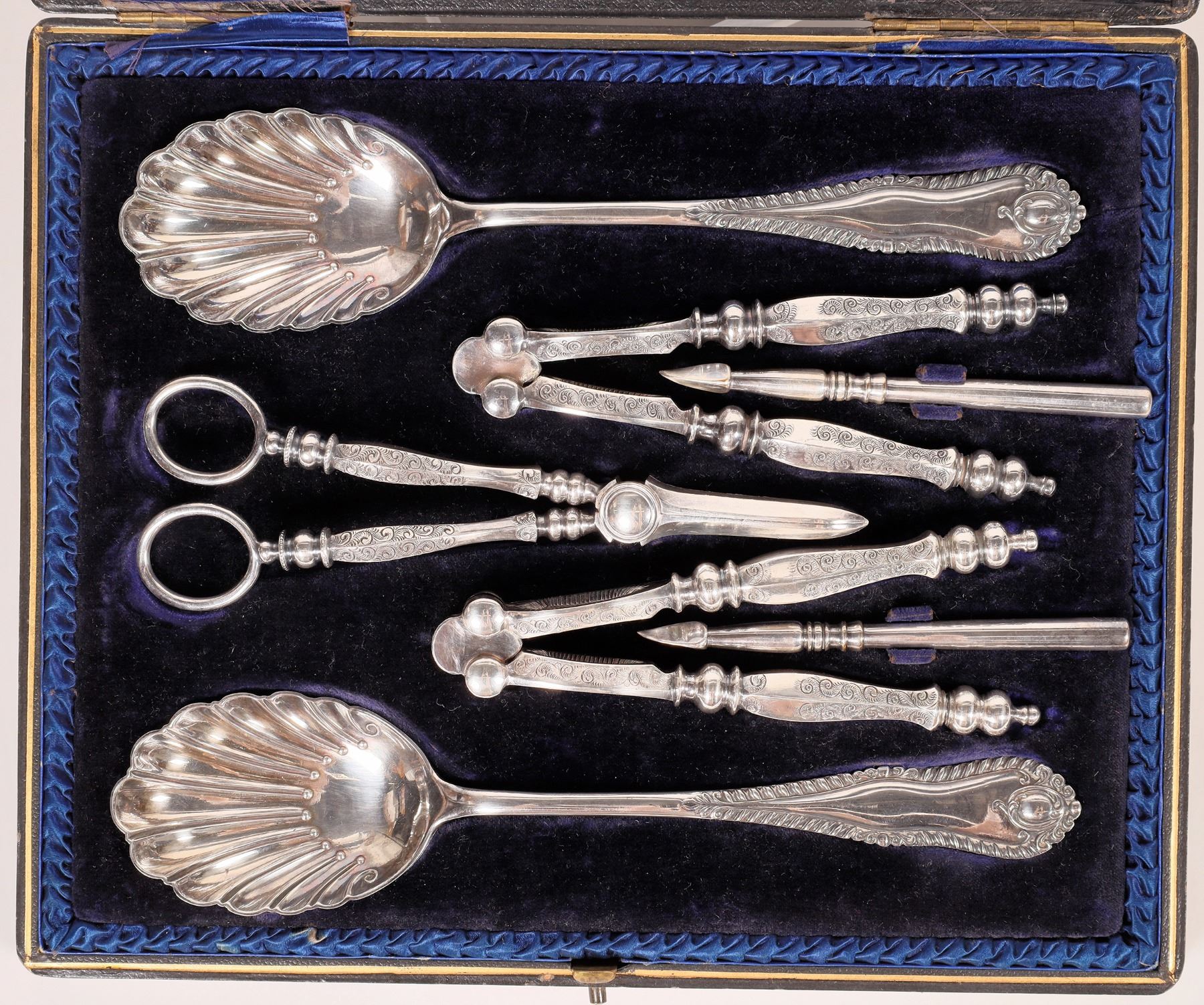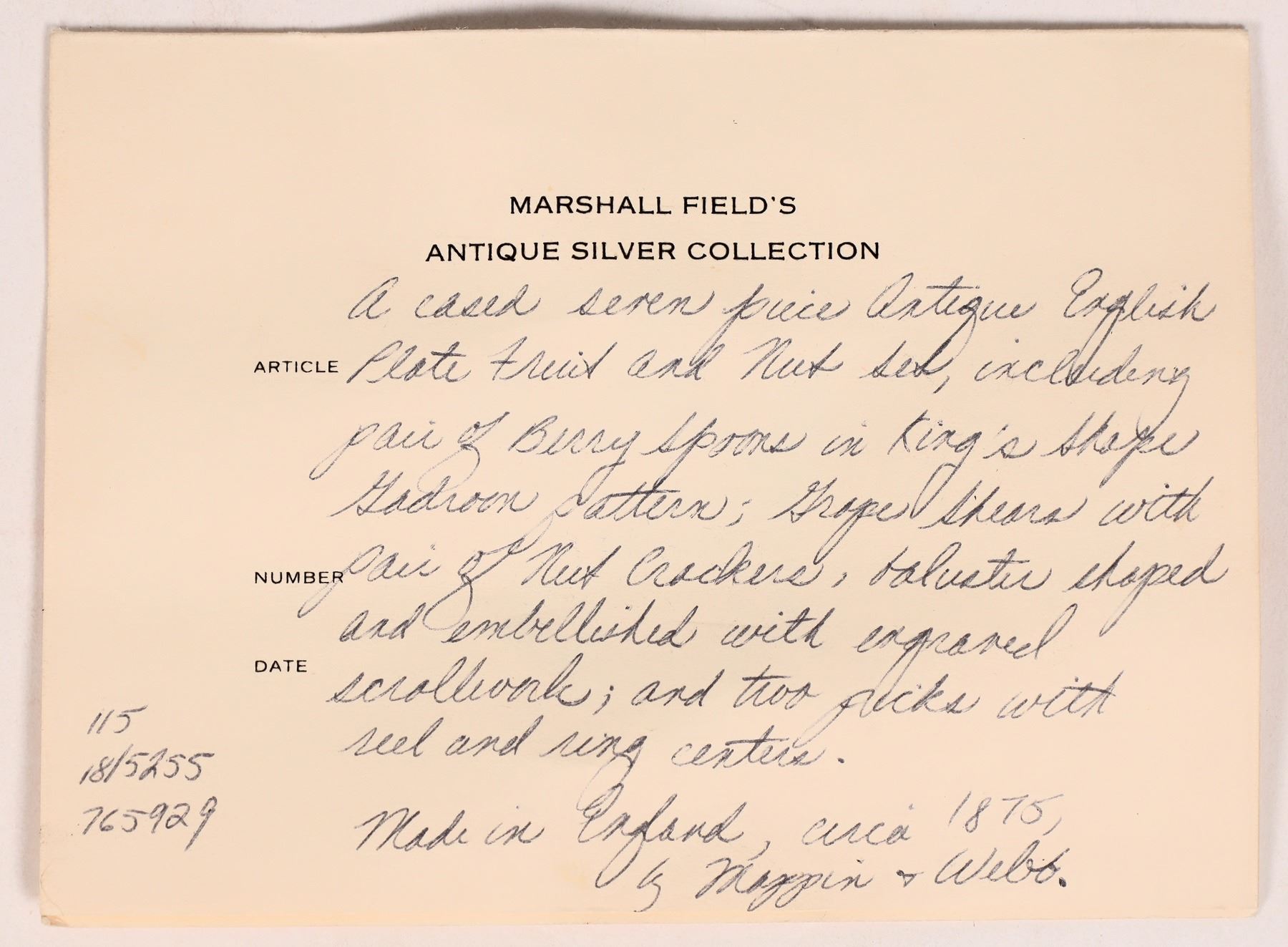 Stovall 27: 1895 Mappin & Webb silver fruit and net set. Cased and hallmarked to 1895. This is a 7-piece set in a gadroon pattern. Very light use with minimal scratches. Includes two large berry spoons, two nutcrackers with two picks, and a set of grape shears. Case is solid but there is some damage to the bottom side of the case. There is an old Marshall Field note incorrectly dating this set to 1875 (the hallmark “U” denotes this as actually 1895). Elegant and beautiful set.