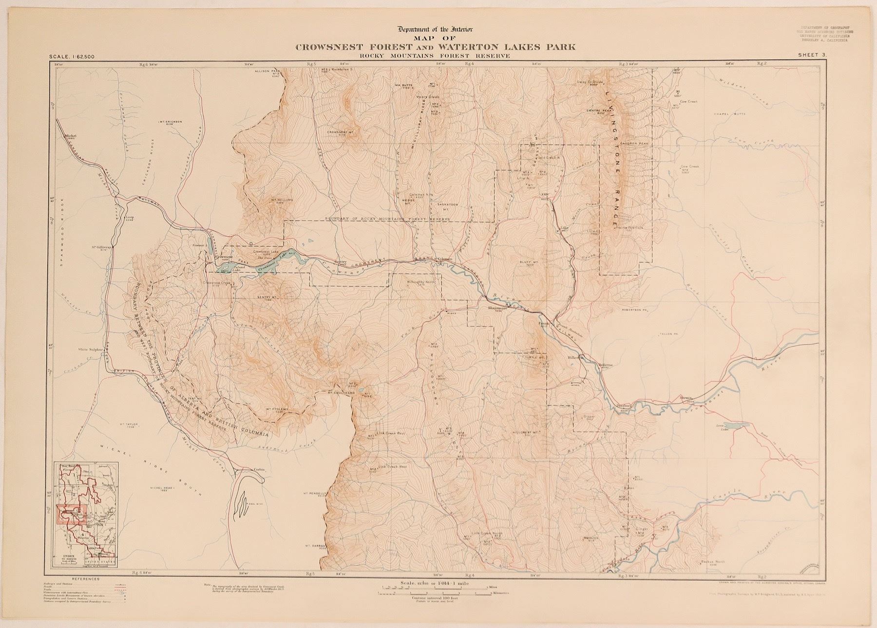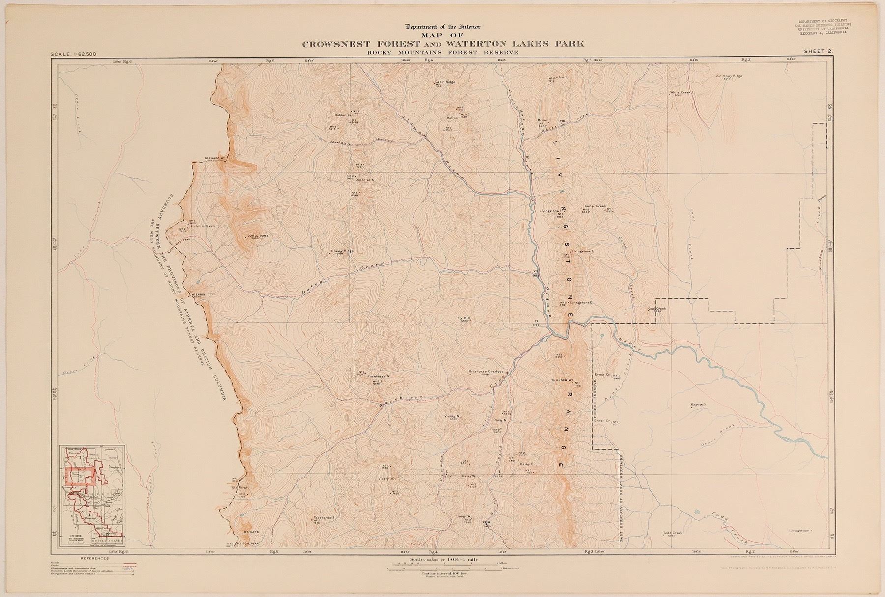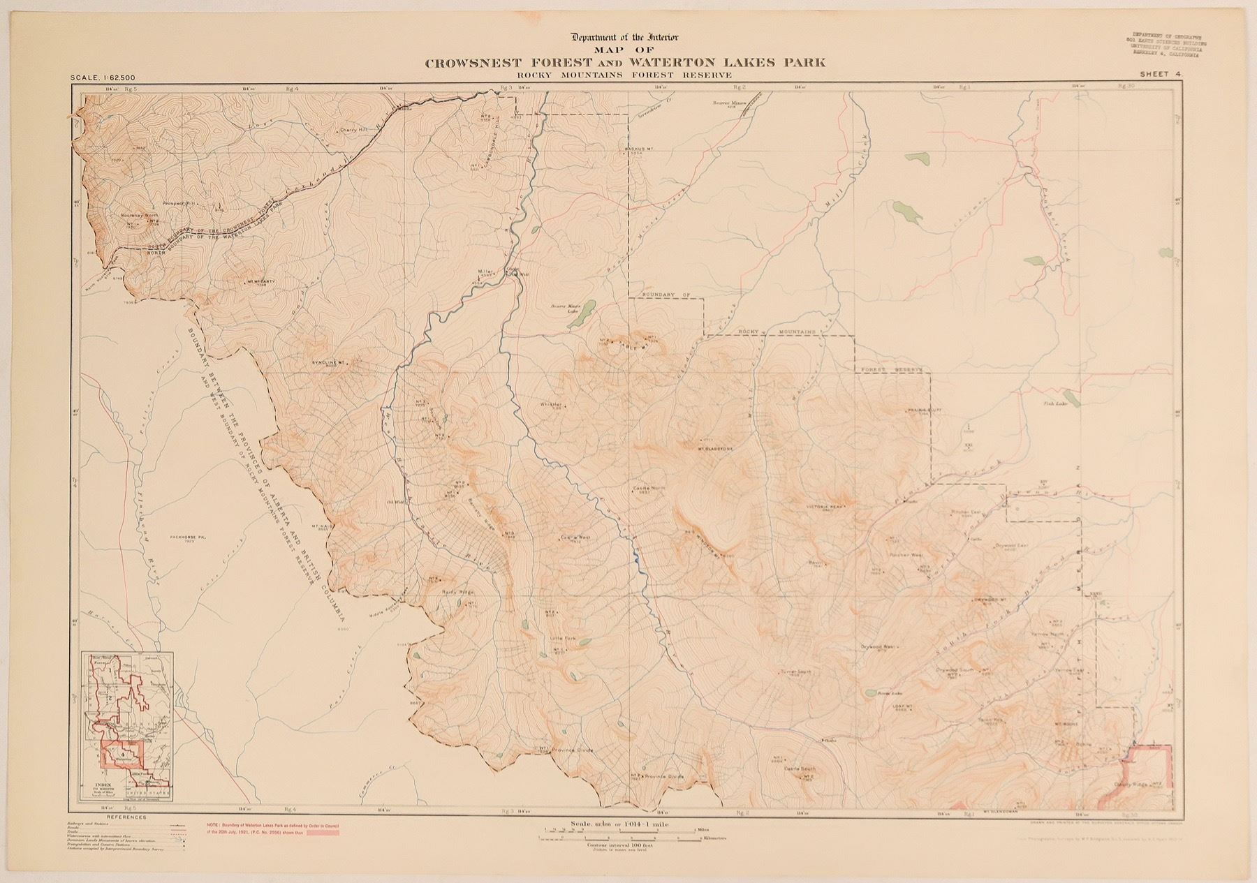 There are five maps (1-5) of the Crowsnest Forest and Waterston Lakes area Rocky Mountain Reserve (Alberta), scale 62.5, surveys by Bridgland and Hyatt 1913-1914. Depicts rail passage and the Rocky Mountain Forest Preserve.