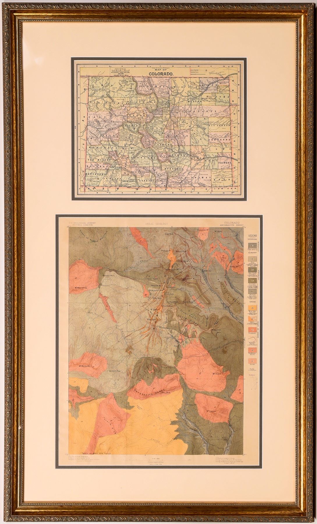 2 nicely framed Colorado Maps. 1. Map of Colorado with districts, copyrighted by Mast, Crowell & Kirkpatrick. Includes details of towns & landscapes. Population in 1890 of 412, 198. 2. Areal Geology of Colorado Anthracite Sheet done by the U.S. Geological Survey with J.W Powell as Director; Henry Gannett, Chief Geographer, Triangulation by the Hayden Survey, topography by Anton Karl & Laurence Thompson, surveyed in 1883 & 1888. Includes scale edition of March 1894. Mentions geologist in charge, S.F Emmons & surveyed igneous and sedimentary rocks in 1884-88. Measures 24 1/2" x 40." Please see the photo! From Nelson A. "Buz" Rieger's exhibition "Rush to the Rockies."