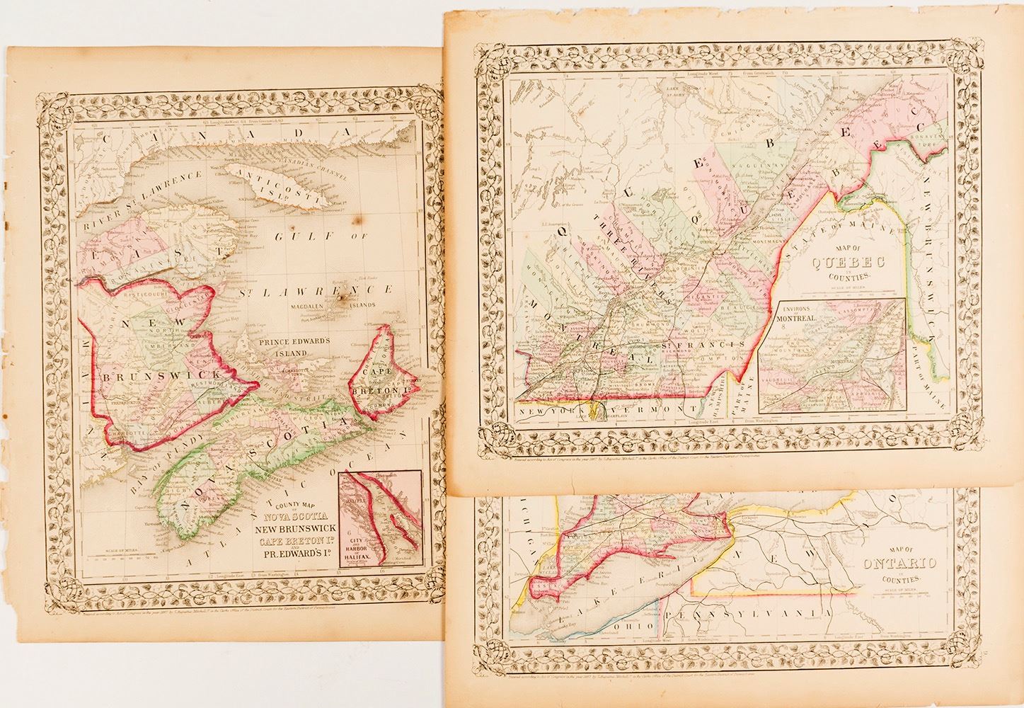 1) Map of County of Nova Scotia New Brunswick, Cape Breton I.d and Pr. Edward's I.d; single page, multi color lithograph, page 5. 15.25" x 12.25"; 2) Map of Quebec in Counties; single page, multi color lithograph with inset of Environs of Montreal, page #7; 3) Map of Ontario in Counties; single page, multi color lithograph, page #9.12.5" x 15.25". Date: 1867 Location: Canada HWAC # 54239