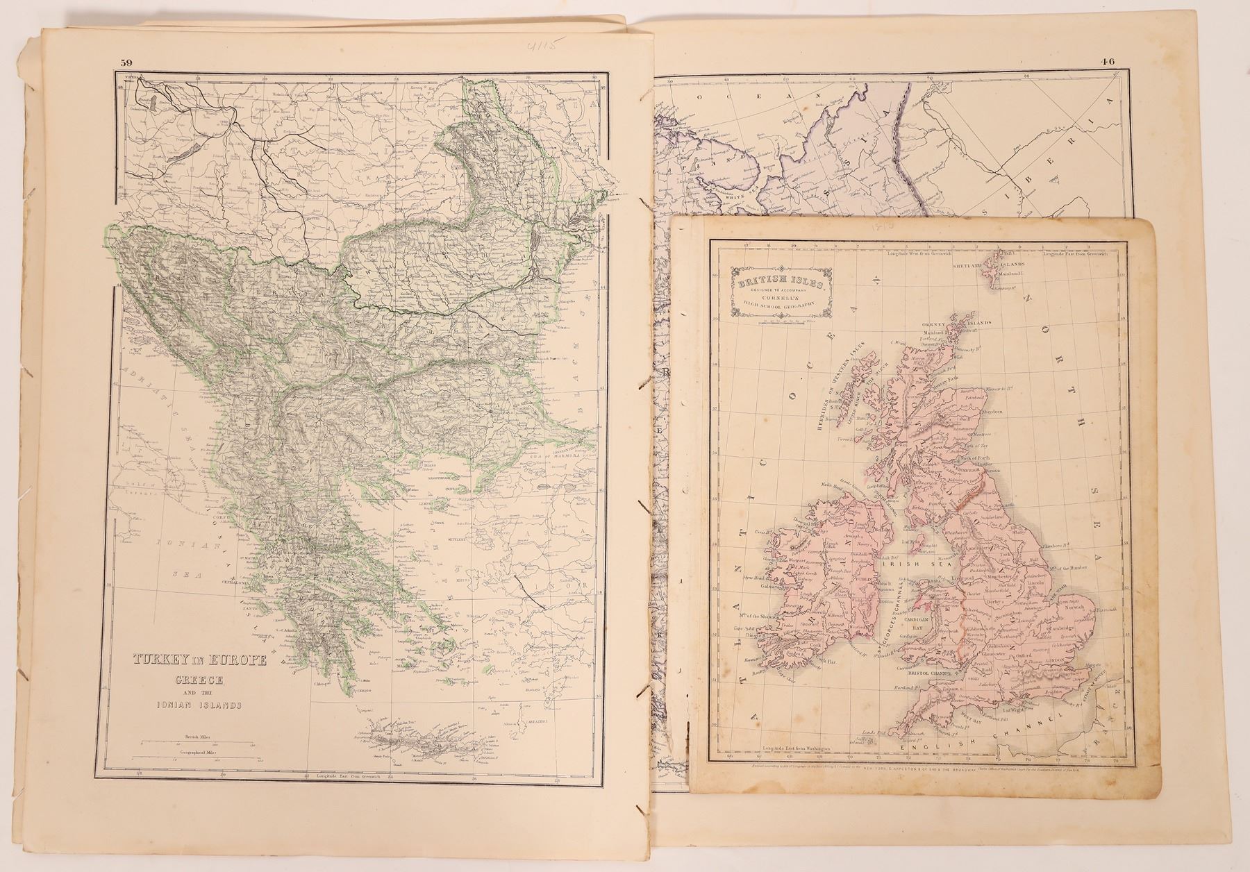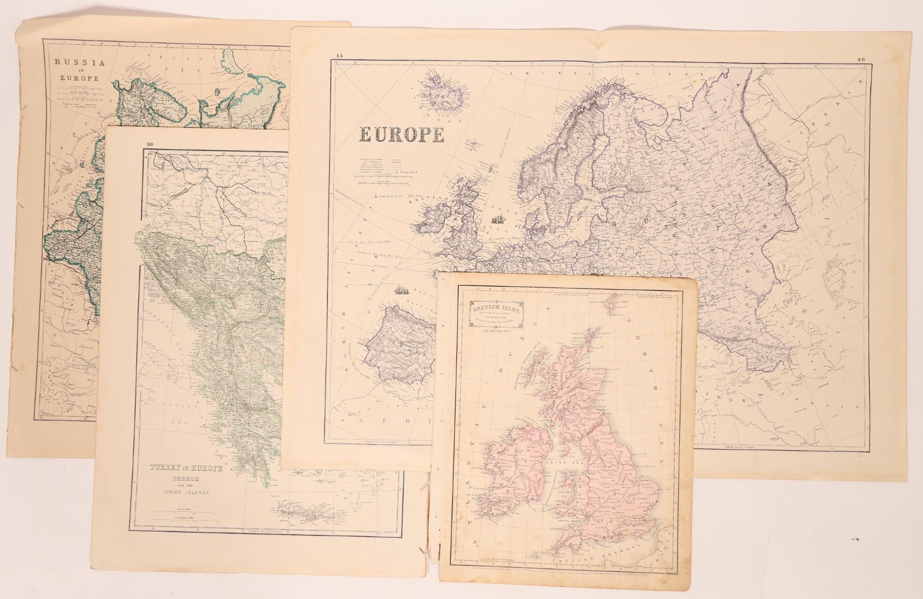 (4) Maps of Europe from atlas. 1. Map of Europe, borders colored in purple, legend includes railways, submarine telegraphs, boundaries of countries, capitals. Images of ships indicate oceans. 27.5 x 19.5 inches. 2. Turkey in Europe, Greece and the Ionian Islands, borders colored in green. 14.765 x 19.5 inches. 3. Double sided map of Russia in Europe and Switzerland. 14.5 x 19.5 inches. 4. Map titled "A Part of Europe Designed to Accompany Cornell's High School Geography", 1856 by S. S. Cornell. Published by New York D. Appleton & Co., countries colored in green, yellow and red. 22 x 13.5 inches.