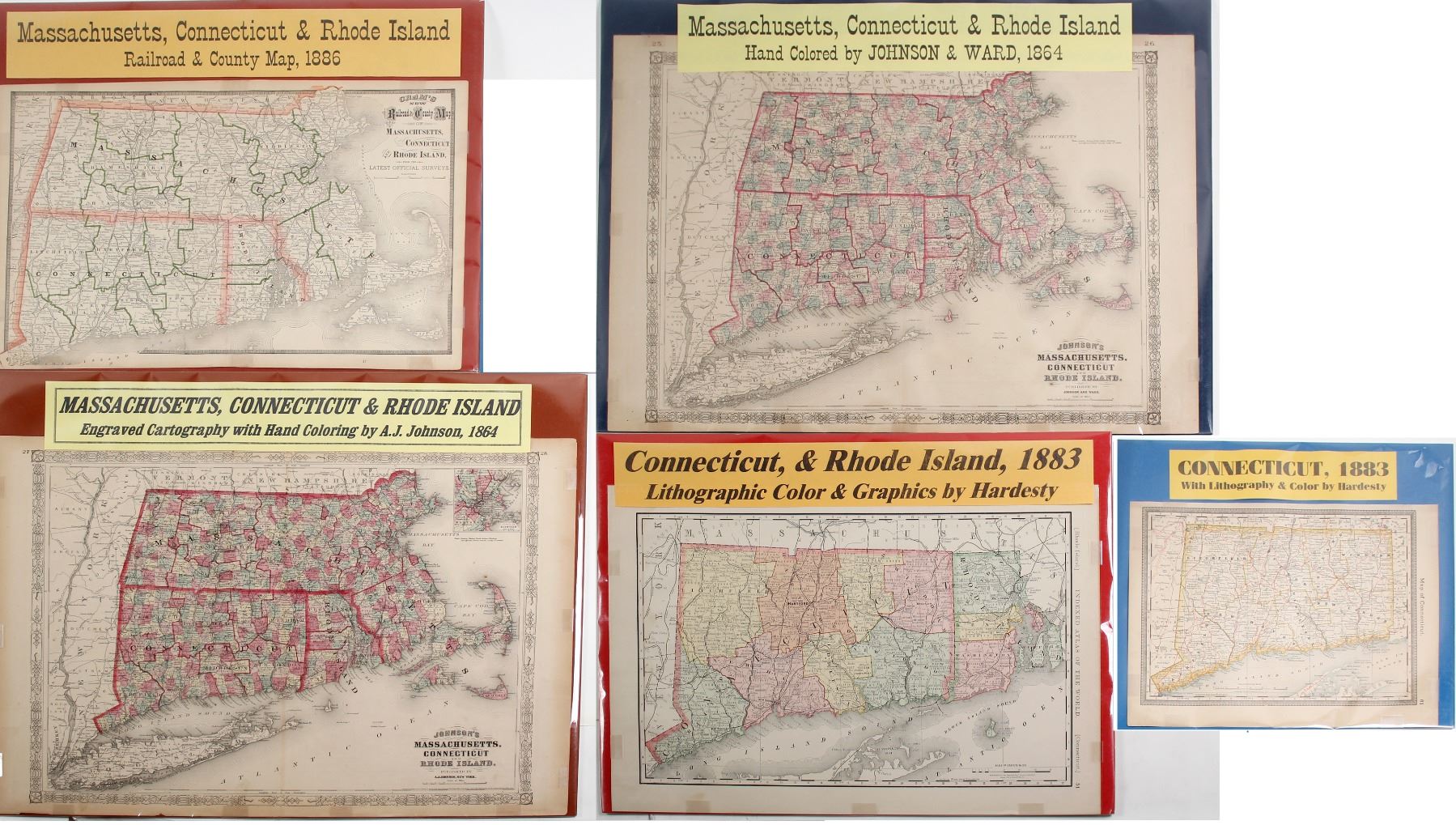 Lot of 5. 1) Connecticut, 1883. Lithography and color by Hardesty. Approximately 14.5" x 11." 2) Connecticut and Rhode Island, 1883. Lithographic color and graphics by Hardesty. 3) Massachusetts, Connecticut and Rhode Island Railroad and County map, 1886. Cram. Approximately 21.5" x 13.5." 4) Massachusetts, Connecticut and Rhode Island. Hand colored by Johnson and Ward, 1864. Approximately 26.5" x 18." 5) Massachusetts, Connecticut and Rhode Island. Engraved cartography with hand coloring by A.J. Johnson,New York, 1864. Approximately 26.5" x 18."