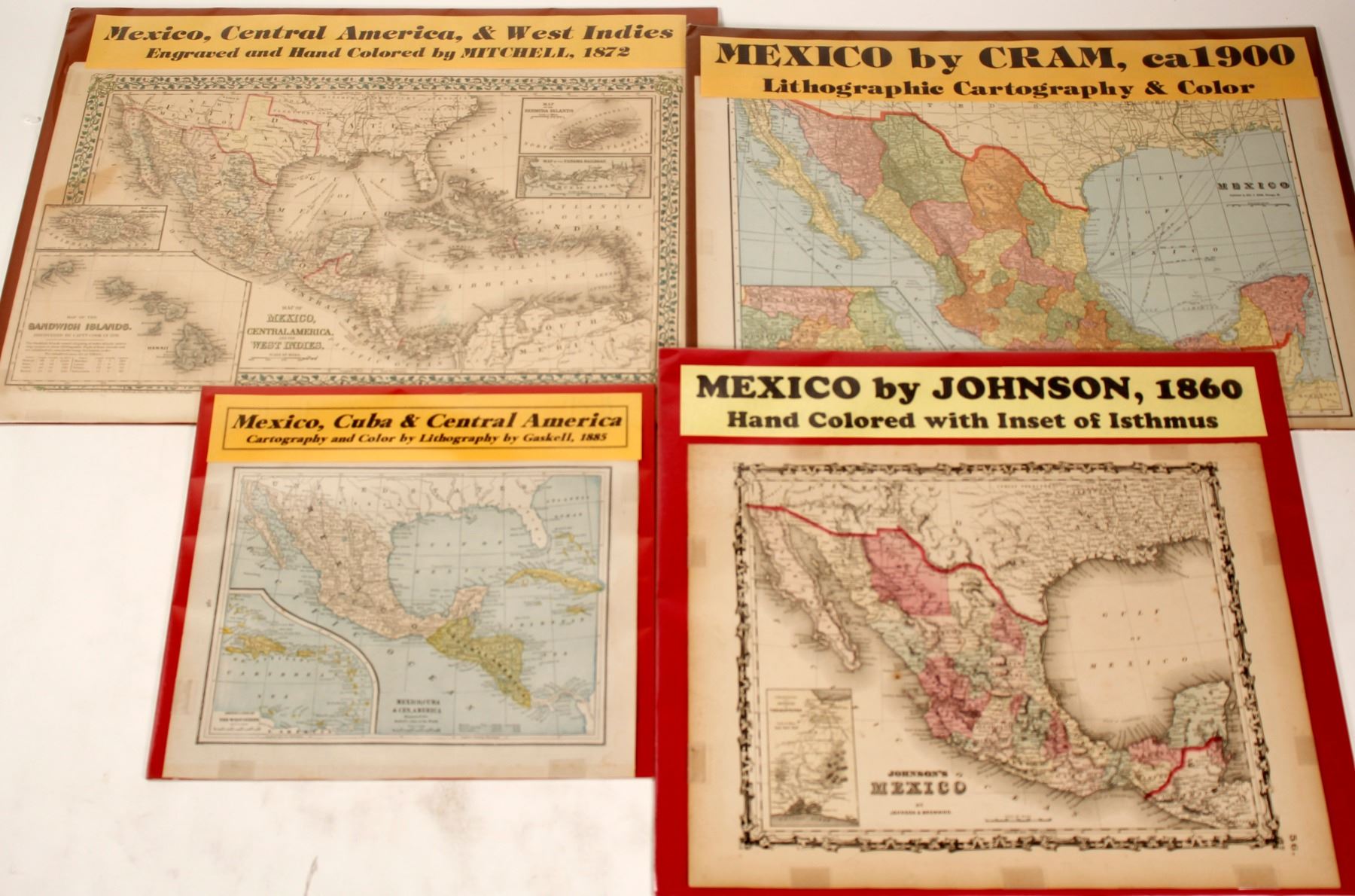 1) Mexico, Cuba, and Central America. Cartography and color by lithography by Gaskell, 1885. Approximately 13.5" x 11.5." 2) Mexico by Johnson and Browning. 1860. Hand colored with inset of Isthmus. Approximately 18" x 14." 3) Mexico by Geo. F. Cram, Chicago. Lithographic cartography and color. ca. 1900. Approximately 14.5" x 22." 4) Mexico Central America, and West Indies. Engraved and hand colored by Mitchell, 1872. Approximately 15" x 23."