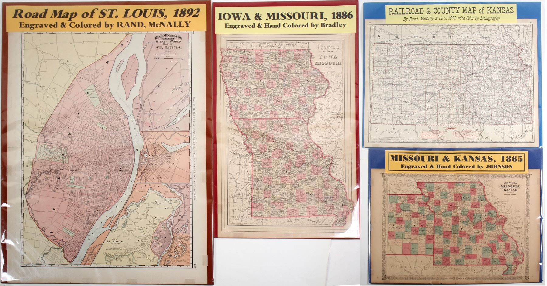 Lot of 4. 1) Iowa and Missouri, 1886. Engraved and hand colored by Bradley. Approximately 15.25" x 23."2) Missouri & Kansas, 1865. Engraved and hand colored by Johnson, New York. Approximately 26.5" x 18." 3) Railroad and county map of Kansas. By Rand, McNally & Co., 1892 with color by lithography. Approximately 27.5" x 20.75." 4) Road map of St. Louis, 1892. Engraved and colored by Rand, McNally. Approximately 22.25" x 29." City: State: Missouri Date: c1865-1892