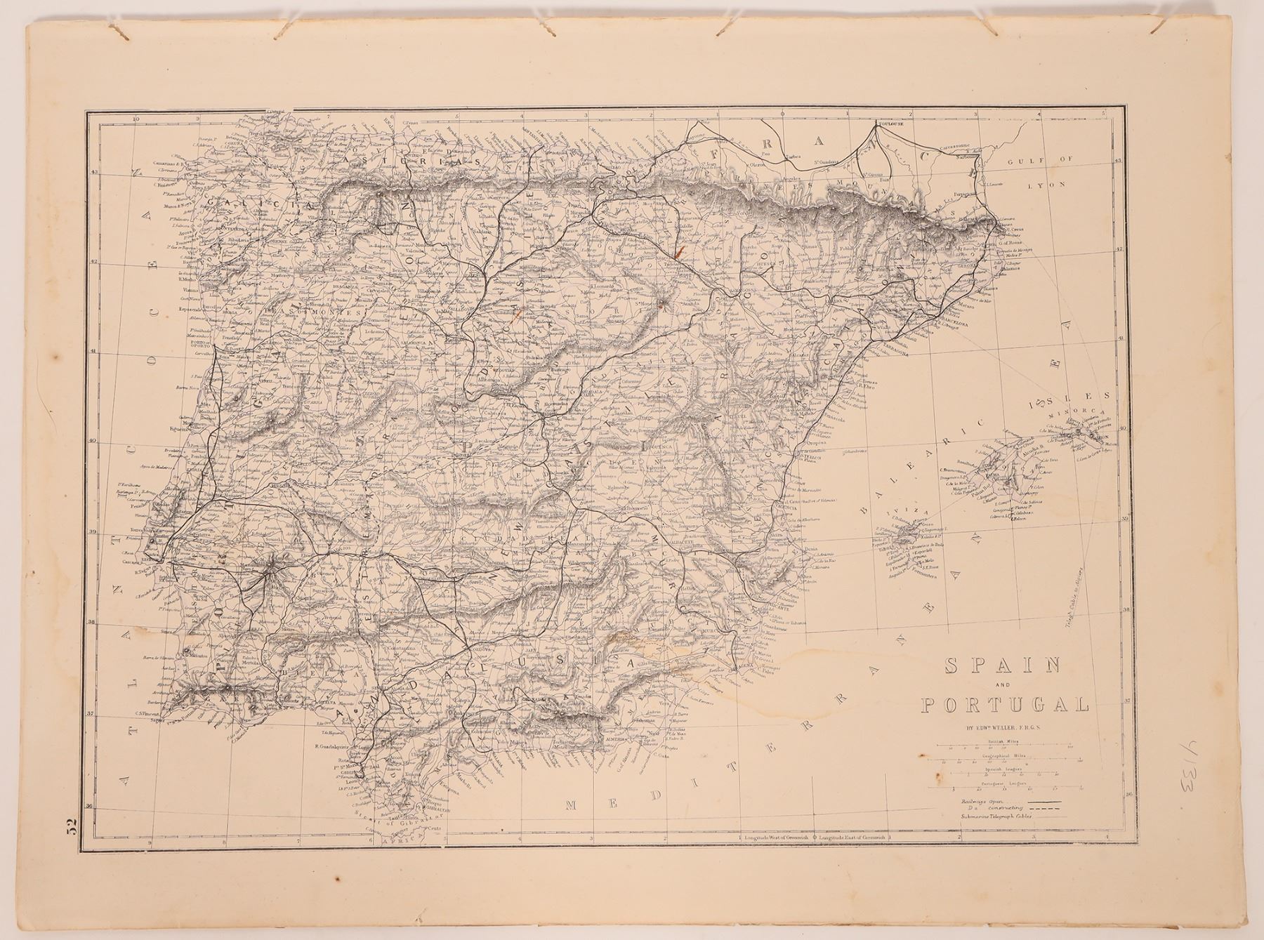 (3) Maps of Spain, Portugal, and France. 1. "Map of Spain, Portugal and France" with inset of Island of Corsica and Switzerland. Detailed and colorful map with floral border. S. Augustus Mitchell Jr. 1862. 12.5 x 15.5 inches. 2. "Map of France", borders defined in purple. emphasis on mountain ranges. c. 1800's. 14.75 x19.5 inches. 3. "Map of Spain and Portugal" by Edward Weller F.R.G.S.. Legend emphasizes railways and submarine telegraph cables. c. 1850's 19.5 x 14.5 inches.
