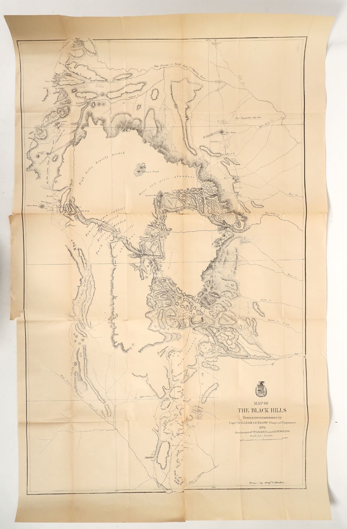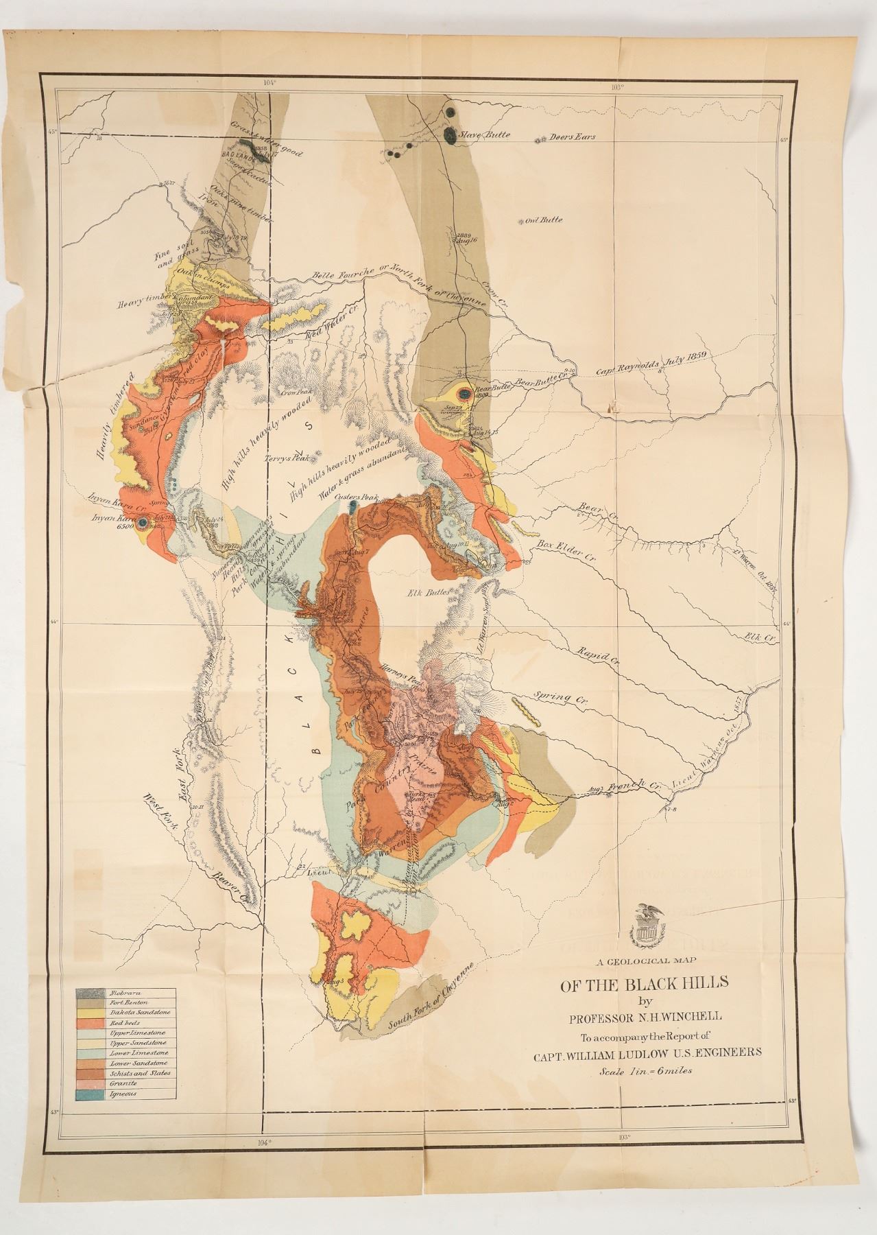 This is a set of two maps labeled "The Black HIlls" made from reconnaissance by Cpt. William Ludlow Corps of Engineers 1874 drawn by Sergt. Becker, and a second geological map by Professor N.H. Winchell. Both maps completed 1874 prior the Custer Battle at the Little Bighorn River. The Winchell map is in color for geological identification. Some tearing at the folds. In very good condition. The Ludlow map at 26 in. X 41 in. The Winchell map is at 19 in. X 27 in. Please see photos for details.
