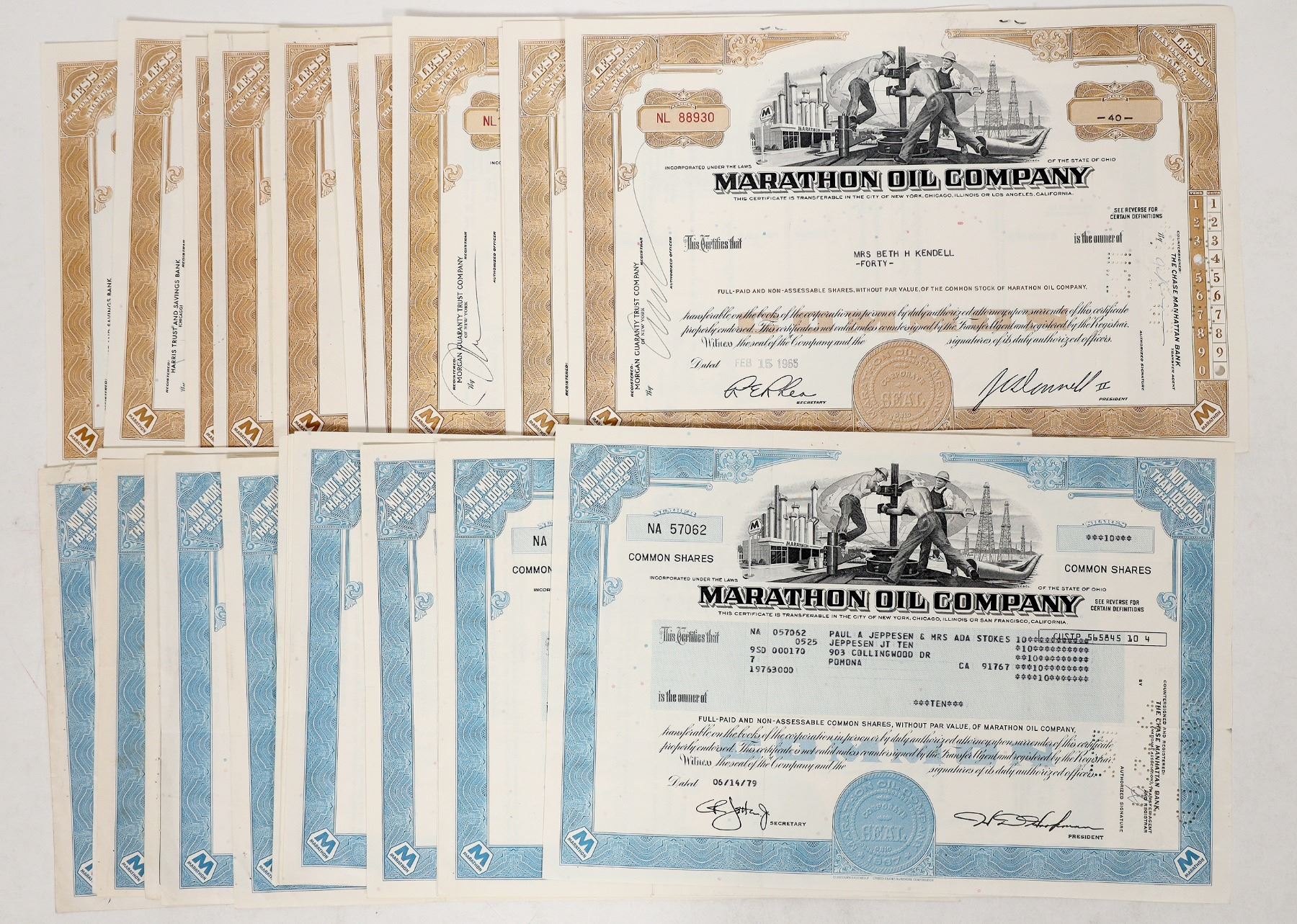 Approx. 28 stock certificates from the Marathon Oil Company, dating from 1970 to 1979. The lot contains both brown and light blue certificates as well as one green certificate. All are issued and cancelled with a hole-punched cancellation. Great vignette of men at work at an oil field. Whole lot in good condition, some minor creasing.