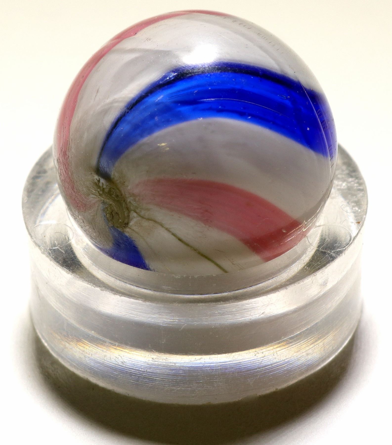 Wow, here is a great peppermint swirl. It is 3/4" , and has 2 pink bands, and two blue transparent bands. These bands are of equal width, and this type is known as a " beach ball" . It is much rarer than the other types.Perfect condition, good texture, and great pontil. ( RH). Stephen Hartman Collection
