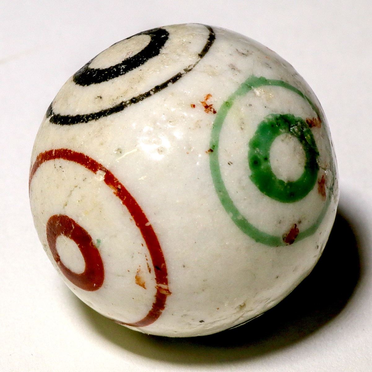 Here is a larger than usually seen specimen. It is a 1" China Bulls Eye". It is called this because there are "6" Bulls eyes on it. 2 red, 2 green & 2 black ones. Nice condition, good glaze. ( RH). Stephen Hartman Collection