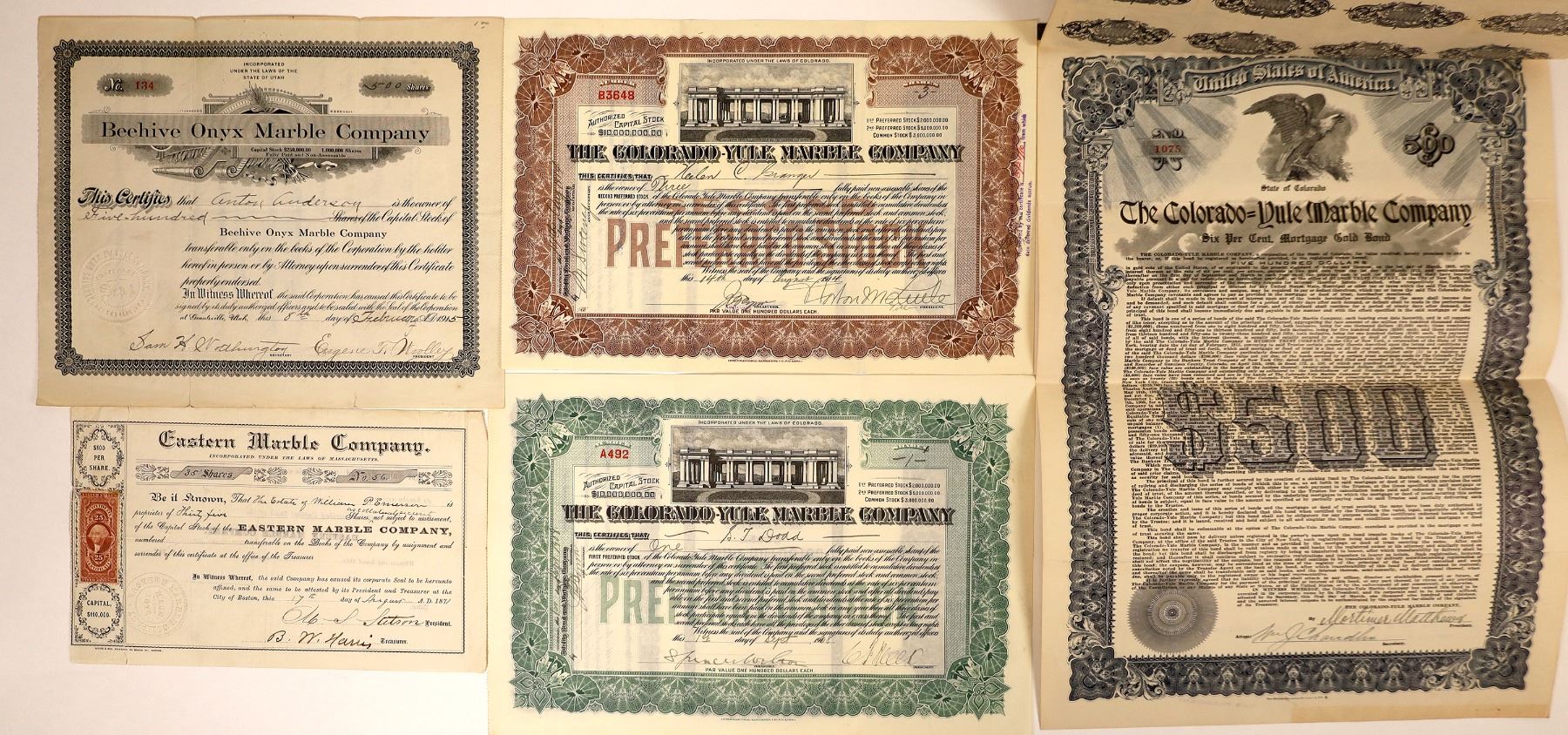Lot of five includes four marble companies' stock certificates, and one bond, from U.S. states, issued from 1871 to 1915. Included are: Eastern Marble Company, No. 56, 35 shares issued in 1871, signed by President Martin S. Stetson and Treasurer Benjamin W. Harris, uncanceled with revenue stamp, embossed seal, 8.75" x 5.5", excellent condition for age with two light folds and very small tear; Beehive Onyx Marble Company, No. 134, 500 shares issued Feb. 8, 1915, signed by President Eugene T. Wooley and Secretary Sam H. Worthington, uncanceled with embossed seal, ornate border, 10" x 8", good condition with slight tears on the bottom of two folds; two certificates and one bond from The Colorado-Yule Marble Company, one cert issued in 1908, signed by President and Treasurer, embossed seal, vignette of greek-inspired building, 11" x 7.25", excellent condition with two light folds, second cert issued in 1914, signed by President and Treasurer, embossed seal, vignette of greek-inspired building, 11" x 7.25", excellent condition with two light folds, and a bond for $500, issued in 1913, signed by President and Secretary, eagle vignette, with 38 coupons attached (two missing), 14.5" x 10.5", excellent condition with light folds.