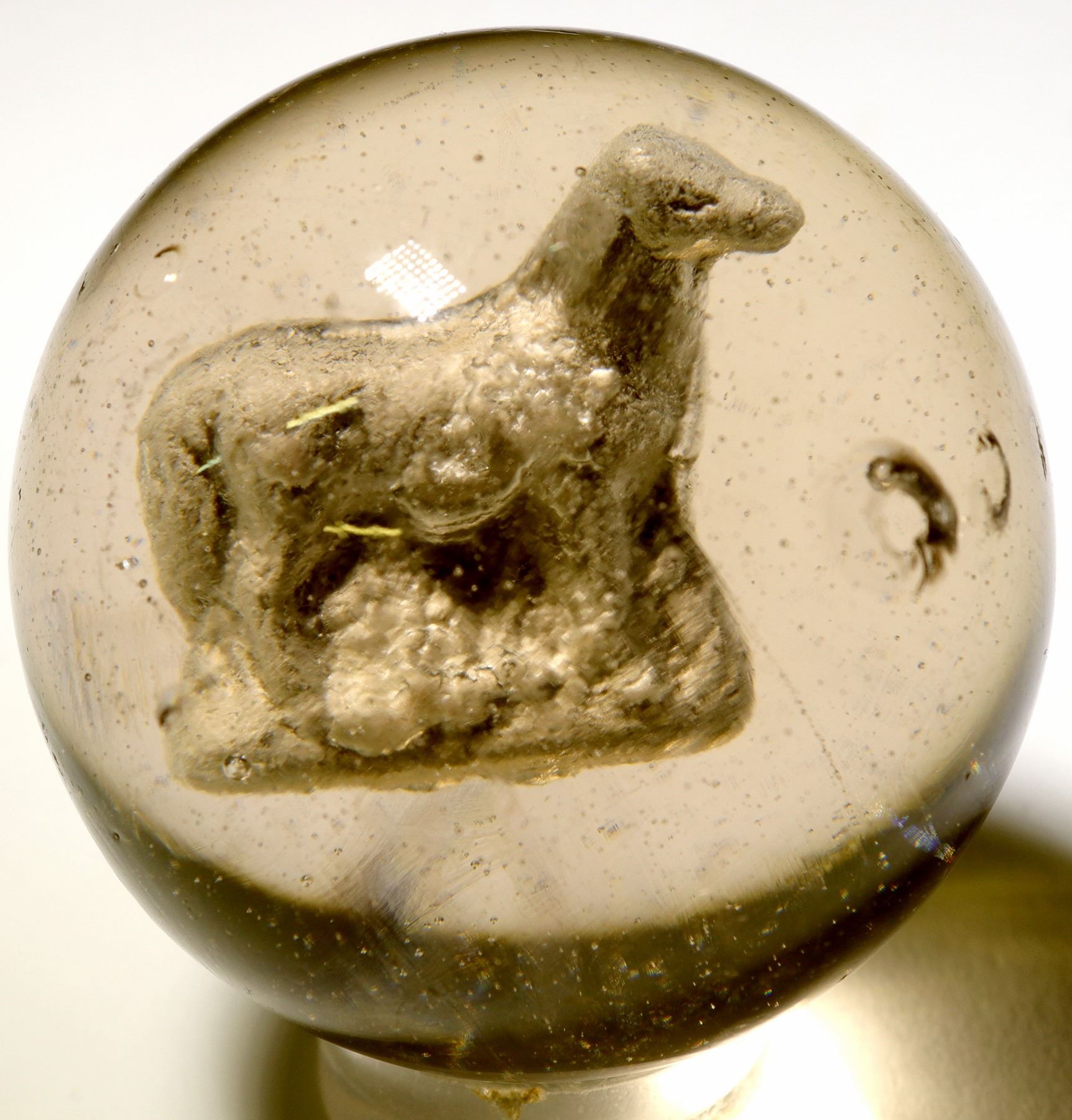 Really interesting item here. It is a " Sulphide Horse". 2 1/8" in size, with a silver figure inside. Nice and clean , but has been polished. It has a number of " Fish Eyes" on the body.but is pontiled. ( RH). Stephen Hartman Collection