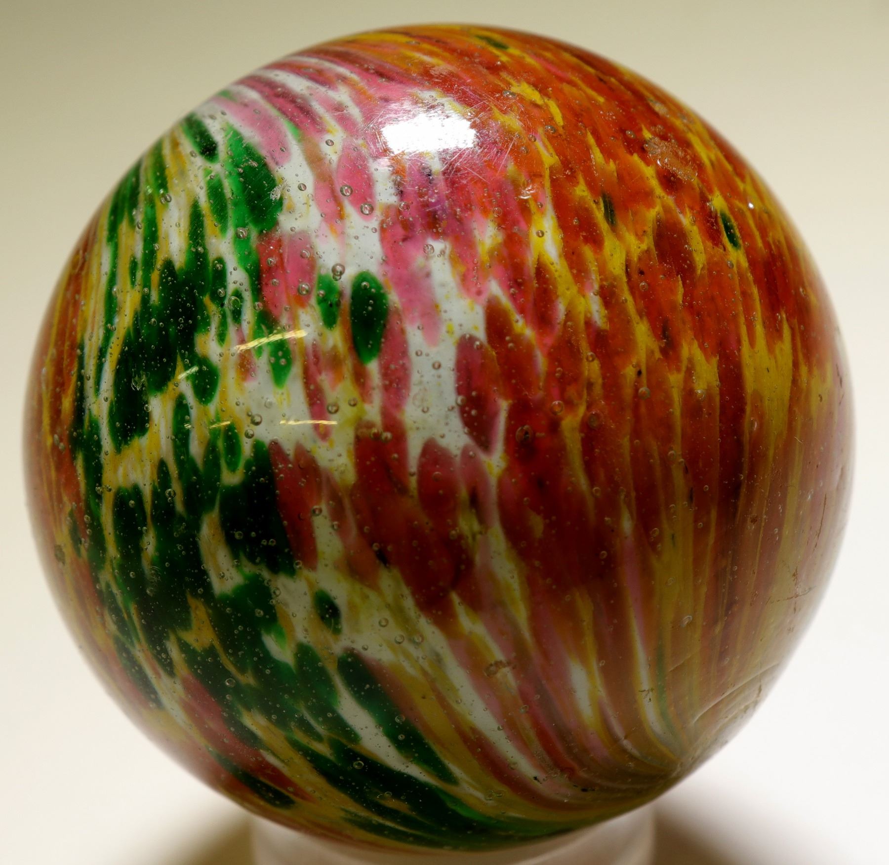 Very nice, large specimen. It is a " Paneled Onion Skin " . It is 1/7/8" in size, with orange and red , n pink white and green bands. Really nice, perfect except for a couple minute reflections, here and there. (RH). Stephen Hartman Collection