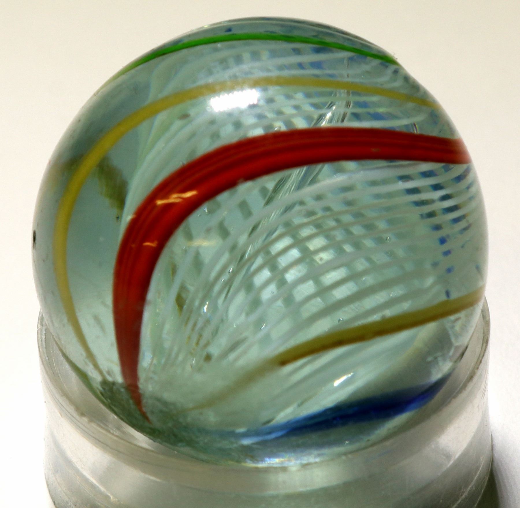 Here is a pleasant looking specimen. It is called a " Latticinio Core Swirl " . It is 1" in size, with a swirling white core. Then, there are also additional swirls in green, yellow, orange, and blue...pole to pole. Very nice condition, and pontiled. ( RH). Stephen Hartman Collection