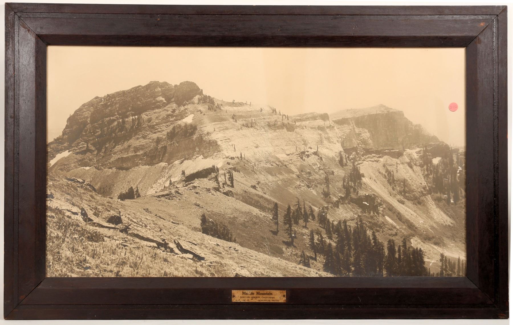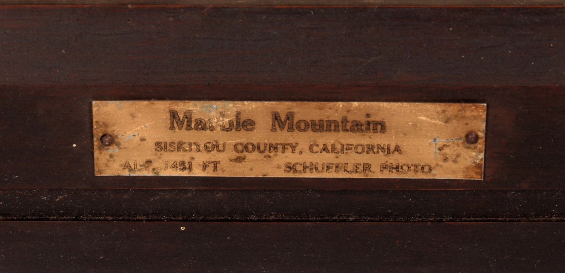 Marble Mountain Siskiyou County Framed Antique Photograph. Schuffler Photos. 26.5 x 42.5 inches with 3.5 inch wood frame. Back is professionally sealed. Brass plaque at bottom center of frame reads: Marble Mountain / Siskiyou County, California / ALT. 7451 FT Schuffler Photo. Part of the Salmon Mountain Range in Northwestern California, Marble Mountain is in a remote region that few travelers navigate due to the rugged terrain. If it were more accessible this region would likely have been designated as a National Park. Original sepia tone enlarged photograph.