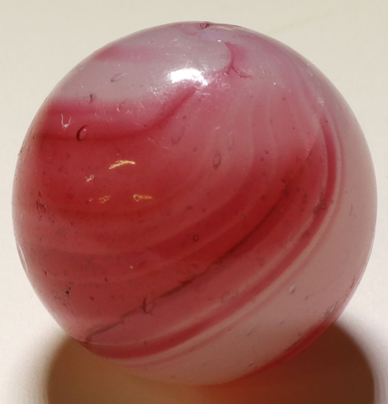 Very pretty specimen. It is a 5/8", " Outerband Swirl". The basic color is a frosty white, with pink n red swirls. Perfect condition, nice texture, and pontiled ( RH). Stephen Hartman Collection