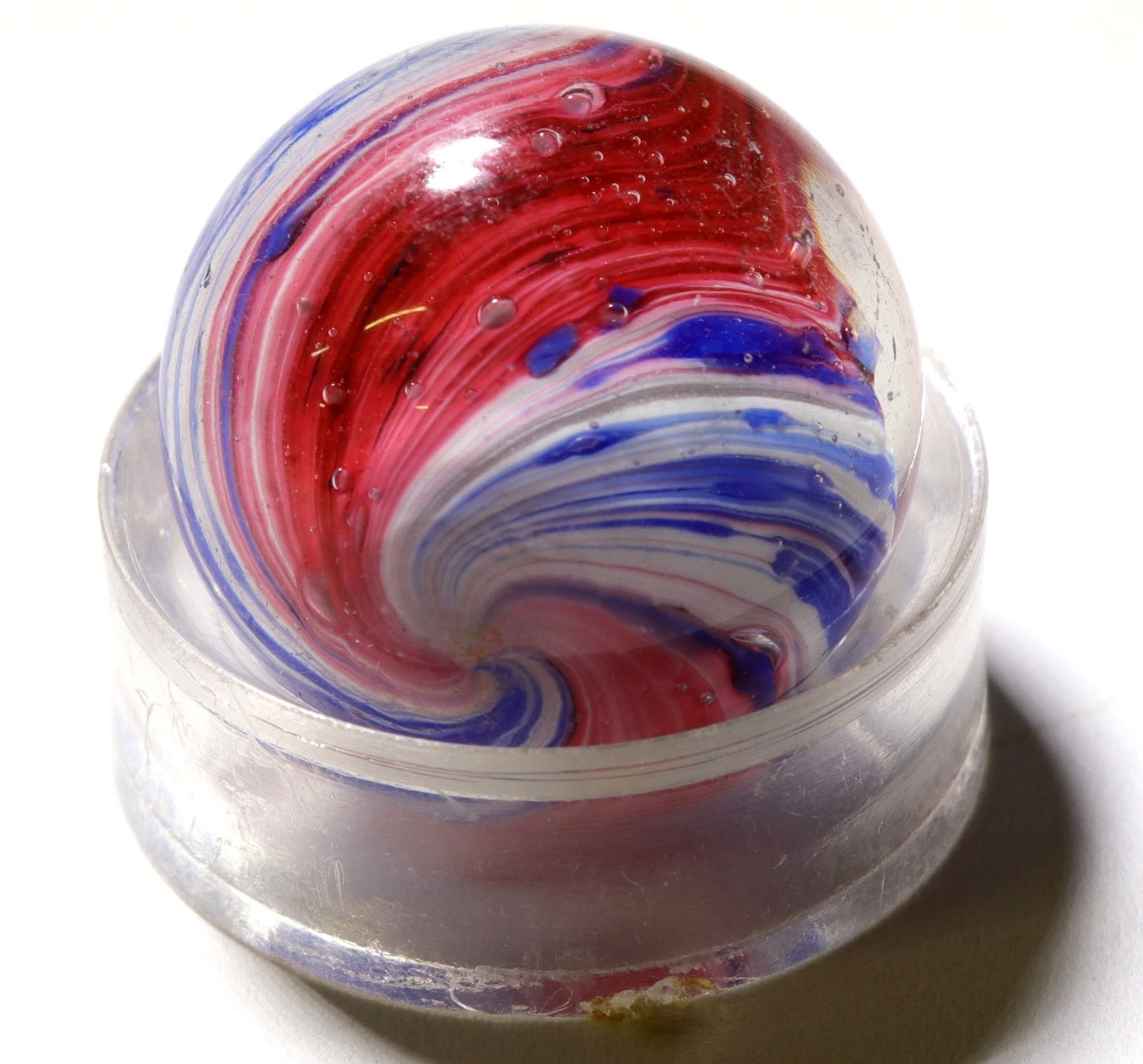 Here we have an outstanding, brilliant colored, paneled Onion Skin . It is 7/8" in size with wide red, blue , and white colorizations , pole to pole. Very tight swirls too. Good looking, perfect condition , good texture , and pontiled. One of the best ( RH). Stephen Hartman Collection