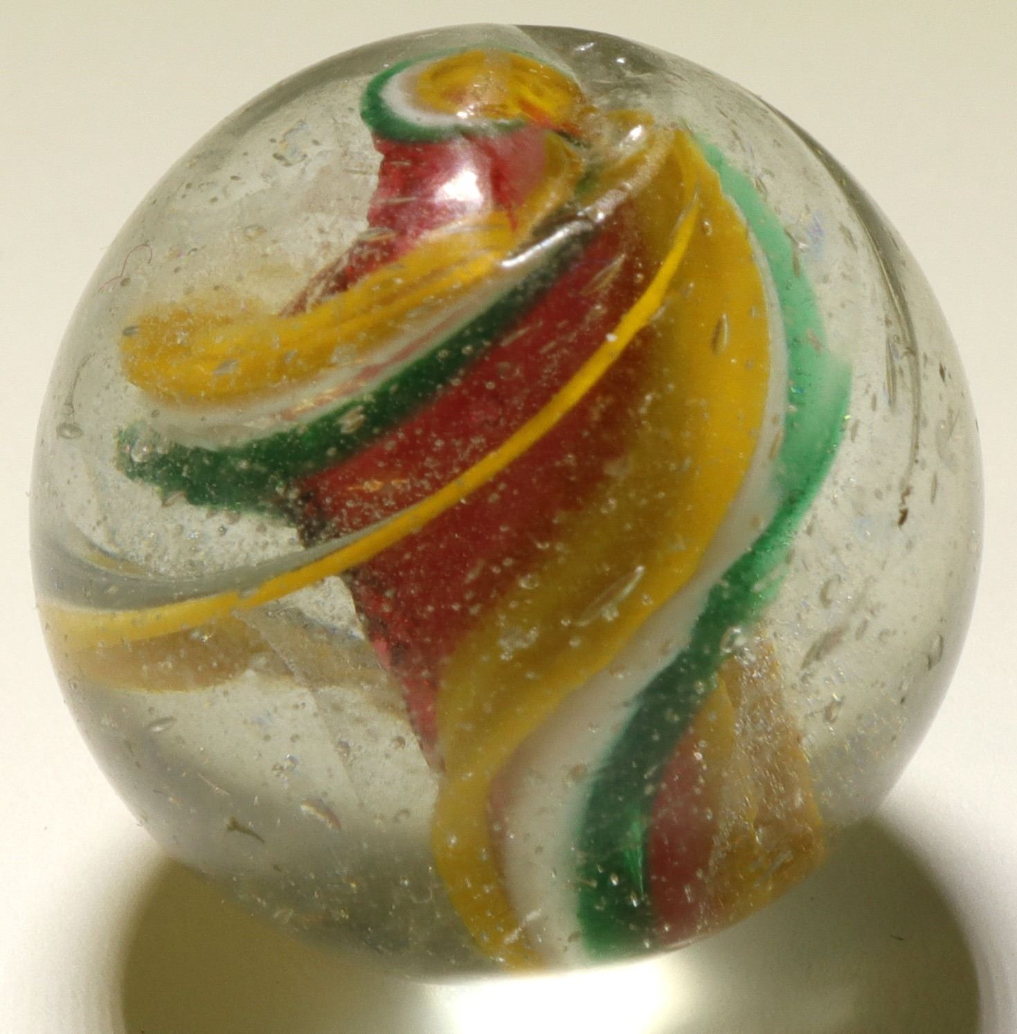 Very interesting specimen. This specimen is clear, with a multi-colored "Ribbon Core", 15/16" in size. The colors are yellow, white, Kelly green , and orange. A little hazy, but nice bright colors, pole to pole. Good condition, with a rough pontil ( RH). Stephen Hartman Collection