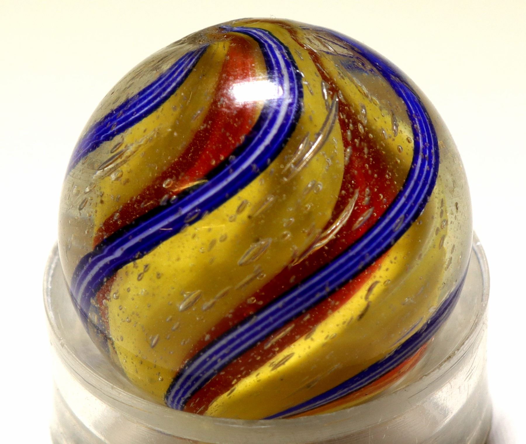 Solid Core, Lobed Onion Skin marble. It is 7/8-inch in size with a orange and yellow solid core. The outer swirls are fine lined, blue and white. All colors, pole to pole. Also, very seedy glass. Perfect condition, and pontiled.
