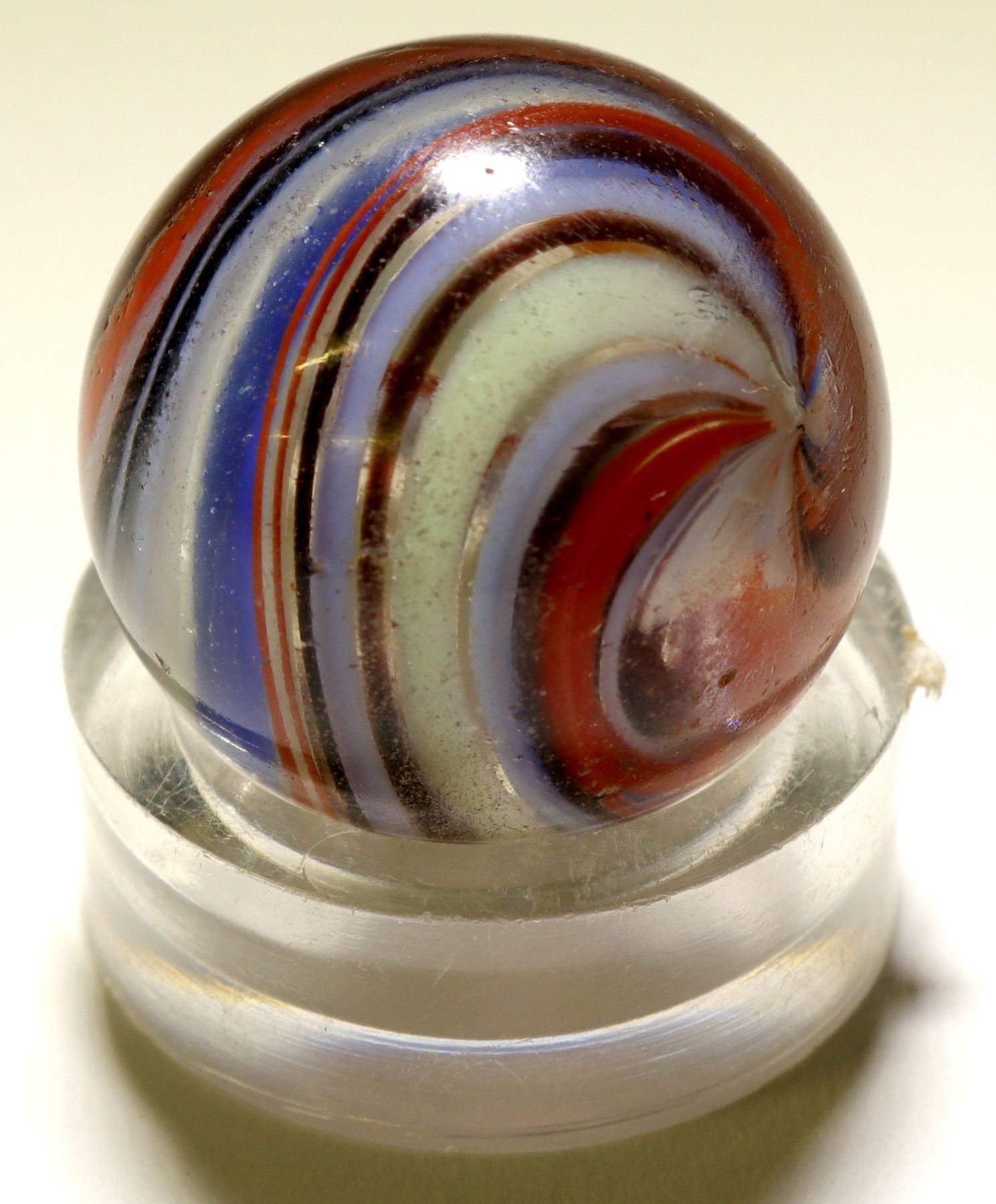 Very interesting, and unusual item . It is 7/8" in size, and is called a "Submarine" . That is because the outer area is clear with additional bands underneath...then, other colors below them. I see salmon pink, and blue , with pale green and white underneath. Plus, a black and lavender swirl mixed in there as well. Mint to Perfect condition, with good texture, and pontiled. very good looking.( RH). Stephen Hartman Collection