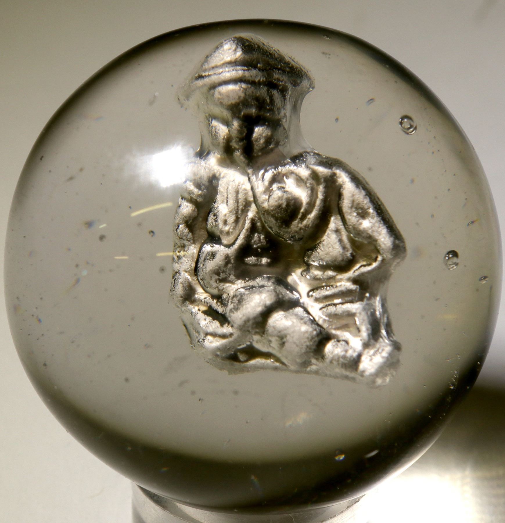 Very unusual, sulphide. It is a " Baby Blowing A Horn". It is 1 3/4" in size, and the silver figure inside is very detailed. Brilliant condition, but this specimen has been polished , and is a bit out -of-round. But, a very rare item (RH). Stephen Hartman Collection