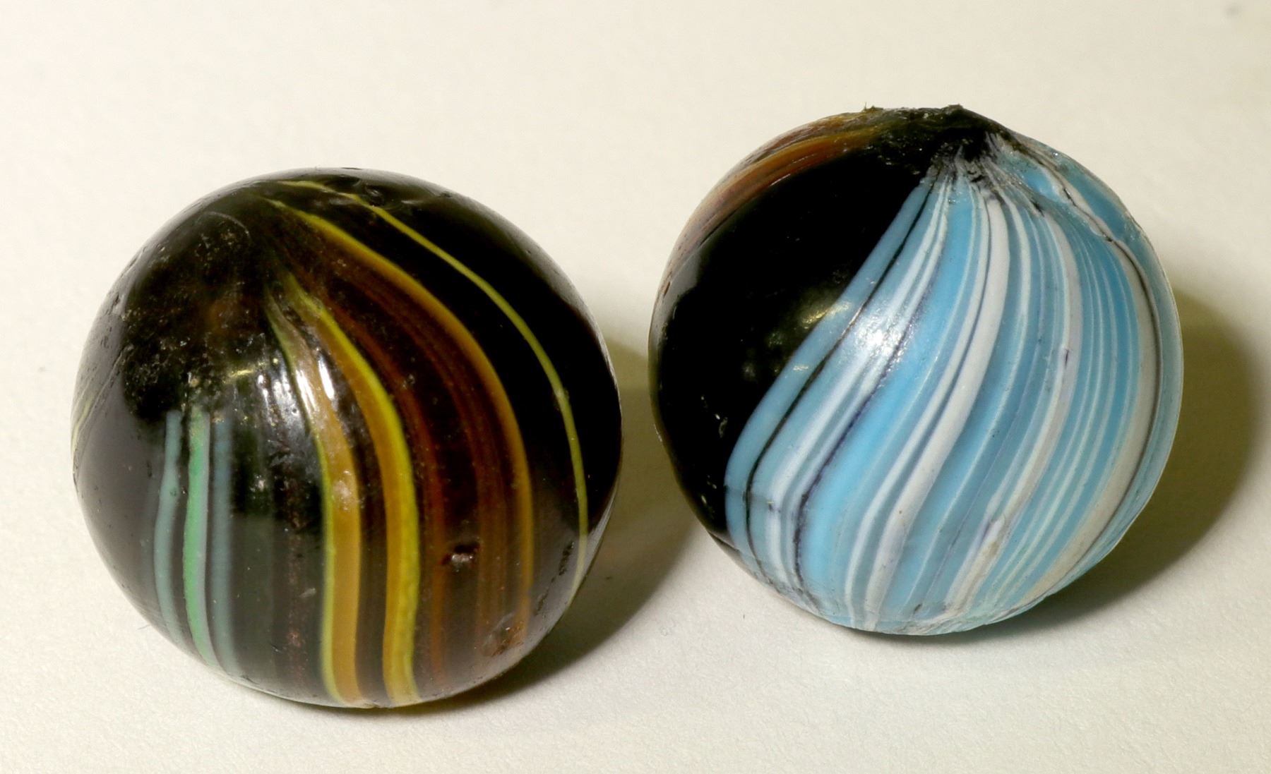 Item #1 of 2: Powder blue and white swirls , between black and caramel chocolate swirls. It is 5/8" in size. Item #2 of 2: Also 5/8" in size, with multi -colored thin swirls...white, blue beige, chocolate, etc. Both items are pole to pole, perfect condition. Nice pair . ( RH). Stephen Hartman Collection