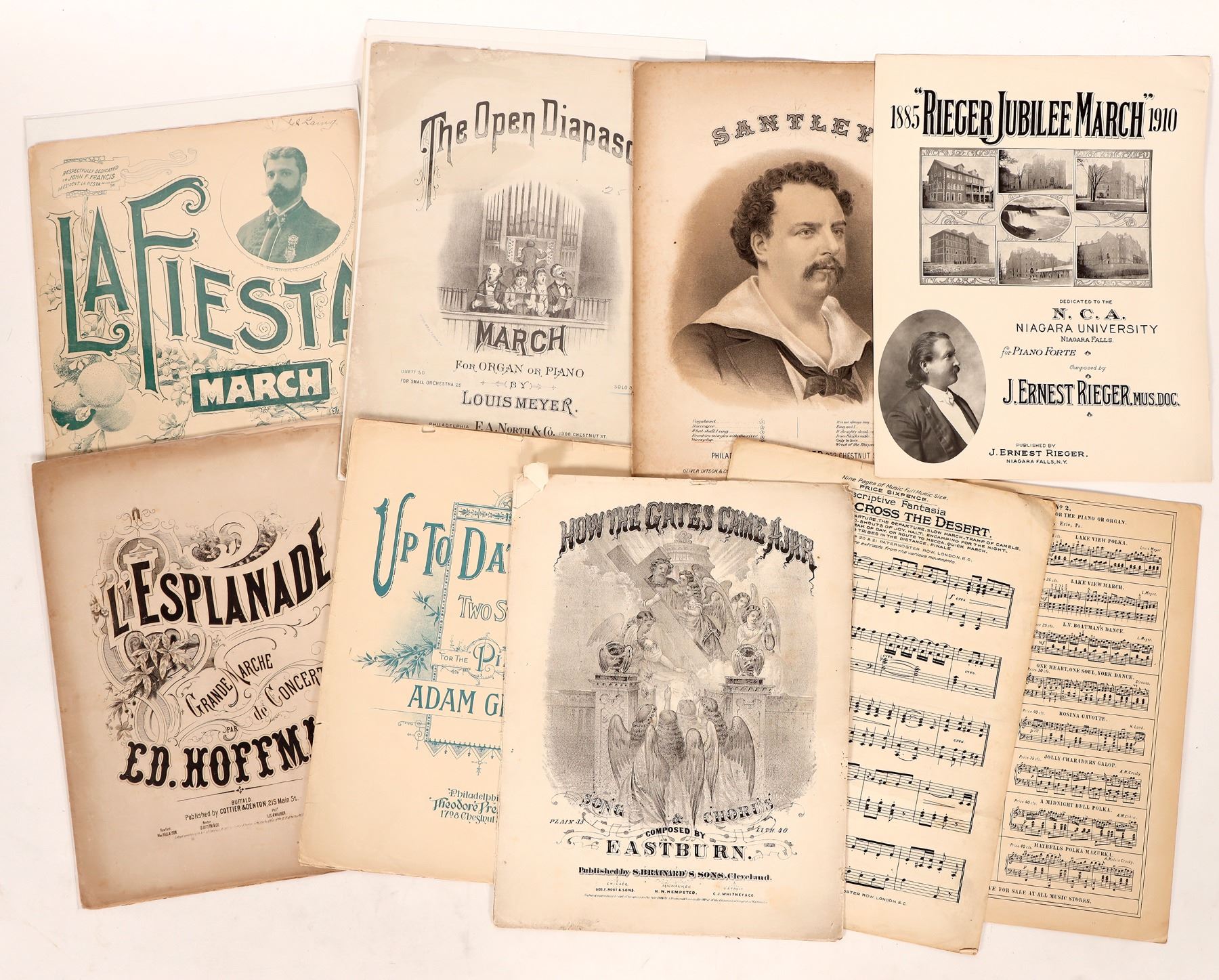 March & Two Step sheet music. Entertain your friends with such hits as Up to Date March, by Adam Gimbel, La Fiesta March, by Alfred Roncovieri, and the unforgettable Open Diapason March, by Louis Meyer and more. All in readable condition, ready for your piano. Please see photos for more details.