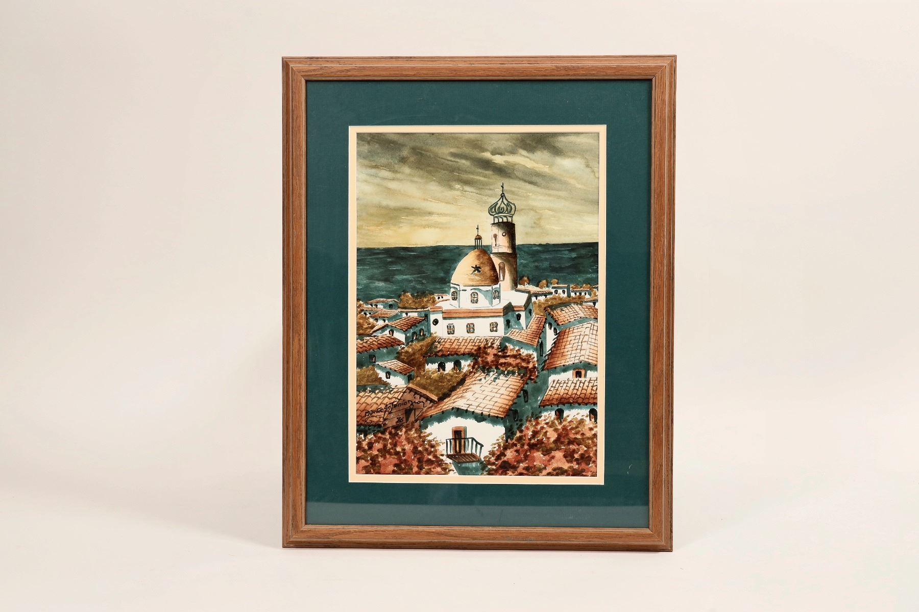 A signed, framed watercolor painting of a church standing over a seaside village by Mexican artist Marco Antonio Diaz. Diaz is known for his village and still-life paintings. This painting captures a striking scene; the church sports a towering dome and minaret, and the adobe houses of the village are a stark white against the dark sea and stormy sky. It is signed 'Marco Antonio Diaz, 96'. It is in excellent condition. Listed dimensions describe the frame; the painting itself is 13.5x9.75 inches.