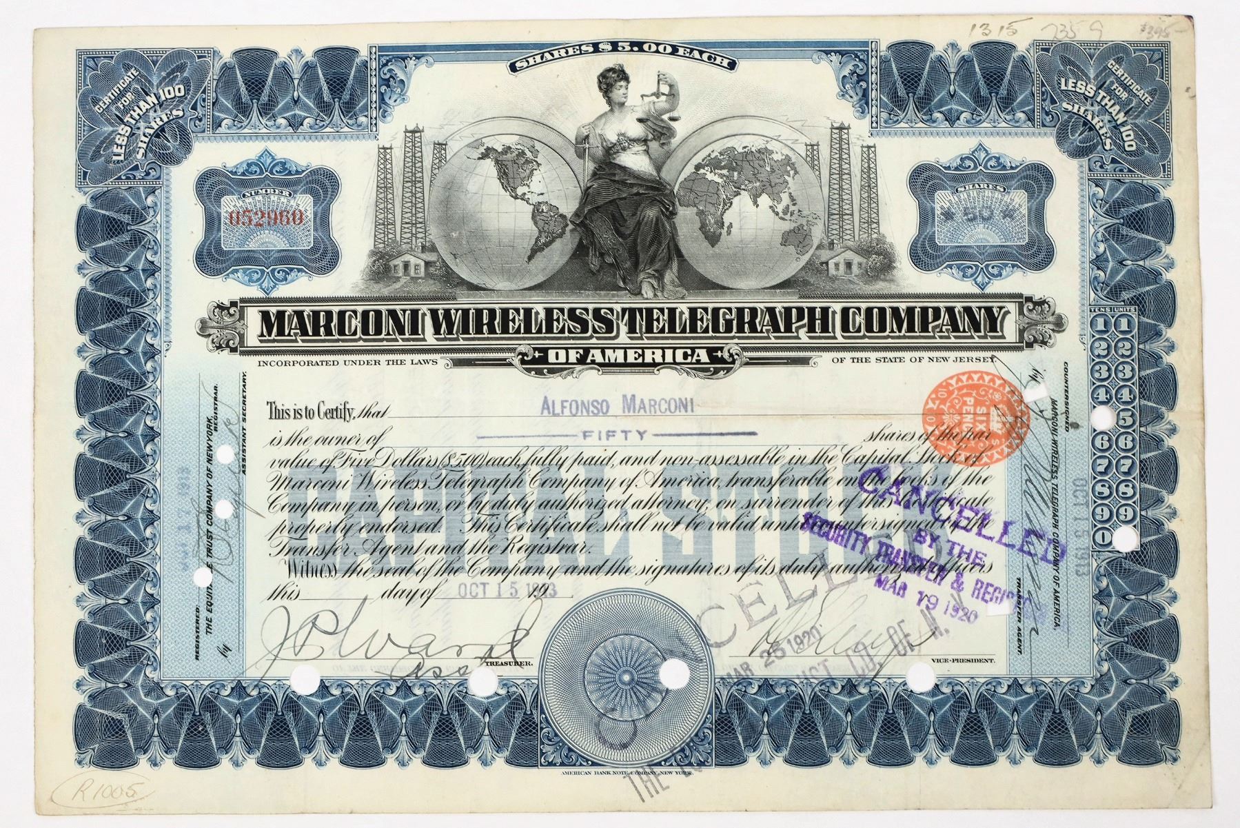 Issued in 1913 to Alfonso Marconi, who was the brother to inventor and telegraph pioneer Guglielmo Marconi, known as "the inventor of radio". Alfonso (1865-1936) assisted his younger brother Guglielmo with his early experiments. He later served as director of the American International Marine Communication Company. Foreign revenue imprint. Punch cancelled. Signed by Alfonso Marconi on the reverse.
